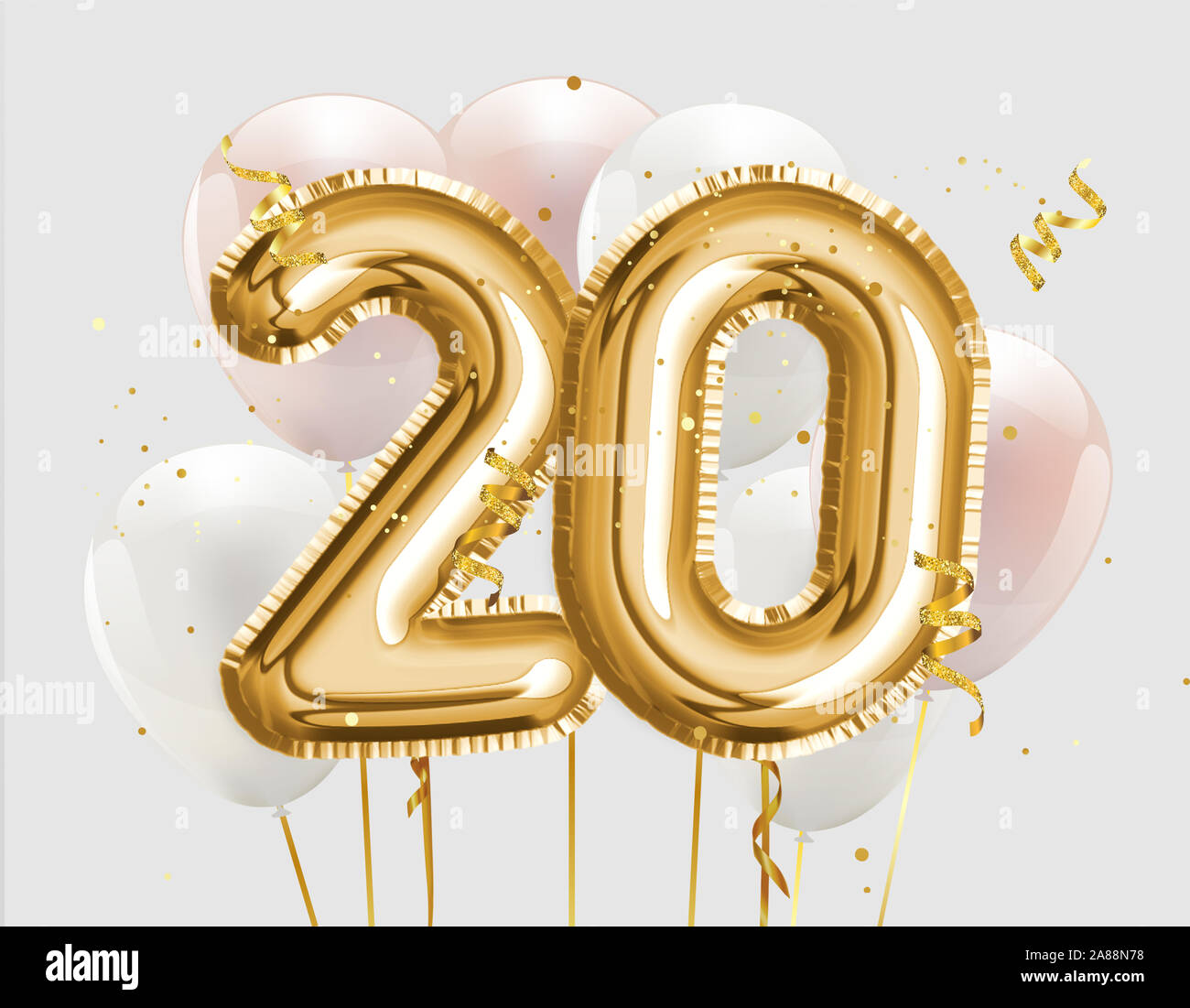 Feliz cumpleaños 20 lámina de oro globo antecedentes saludo. 20 años aniversario logo plantilla- 20 celebrando con confeti. Photo Stock Fotografía de stock - Alamy