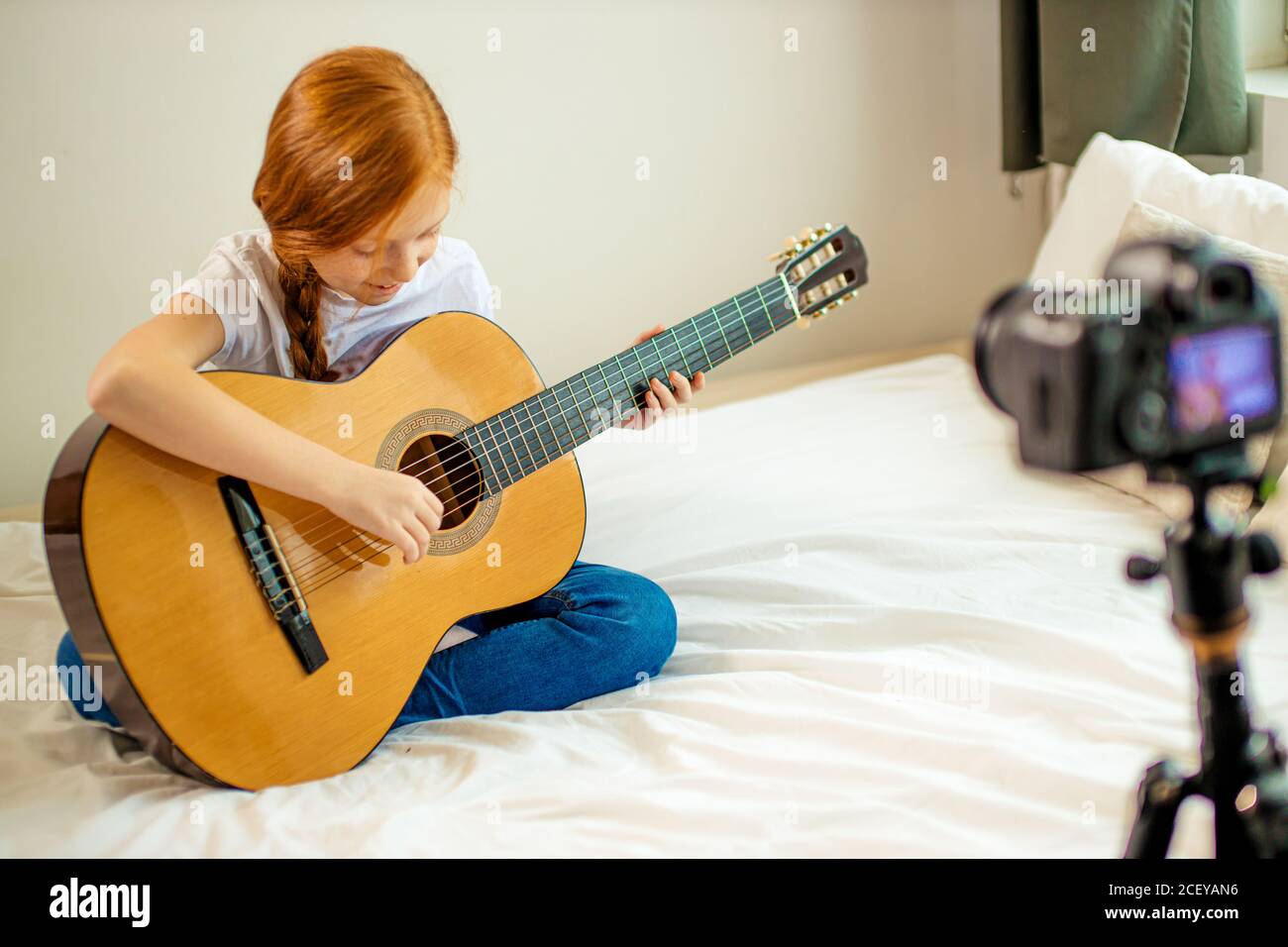 Retrato de una niña dulce blogger estudiando acordes en guitarra acústica, ella se sienta en casa, disfrutar tocando la guitarra Fotografía de stock - Alamy