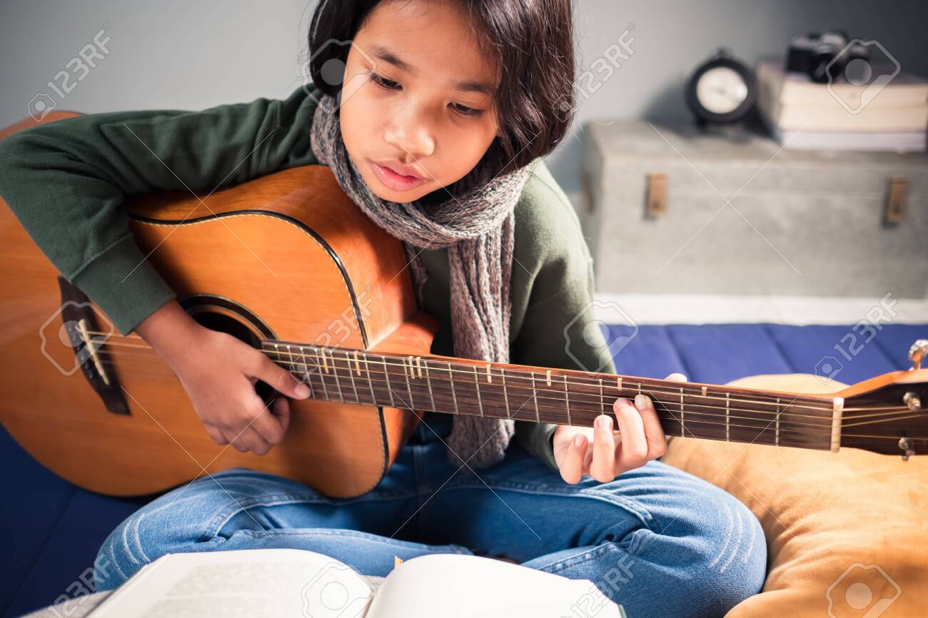 Cierre A Una Niña De Nueve Años Sentada En El Colchón De Su Dormitorio Y Practique La Guitarra Mirando Las Letras Y Los Acordes En El Libro De Lecciones Frente A Ella