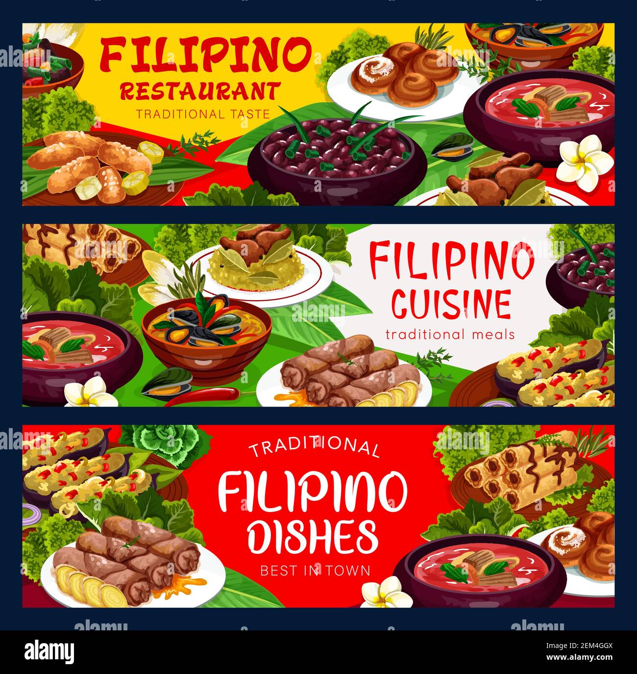 Banderas de la cocina filipina, platos de comida nacional y comidas. Ensaimada, adobo con pollo, mejillones en salsa de coco, frijoles. Restaurante filipino v Imagen Vector de stock - Alamy