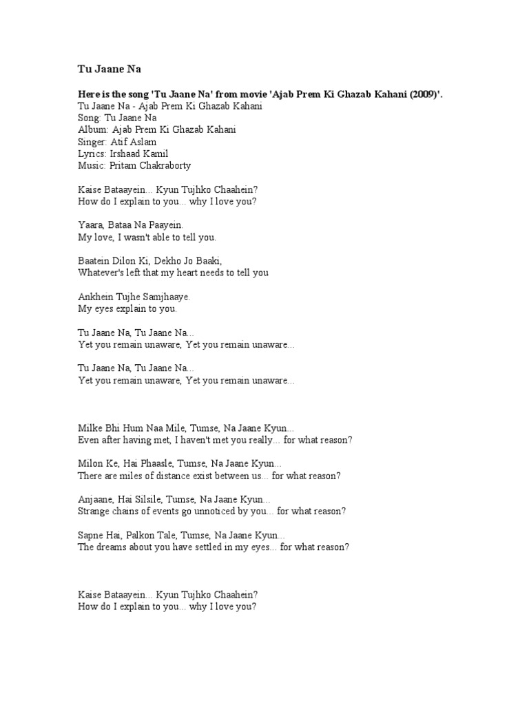 Atif Aslam & Pritam – Tu Jaane Na (From "Ajab Prem Ki Ghazab Kahani") Lyrics | Genius Lyrics
