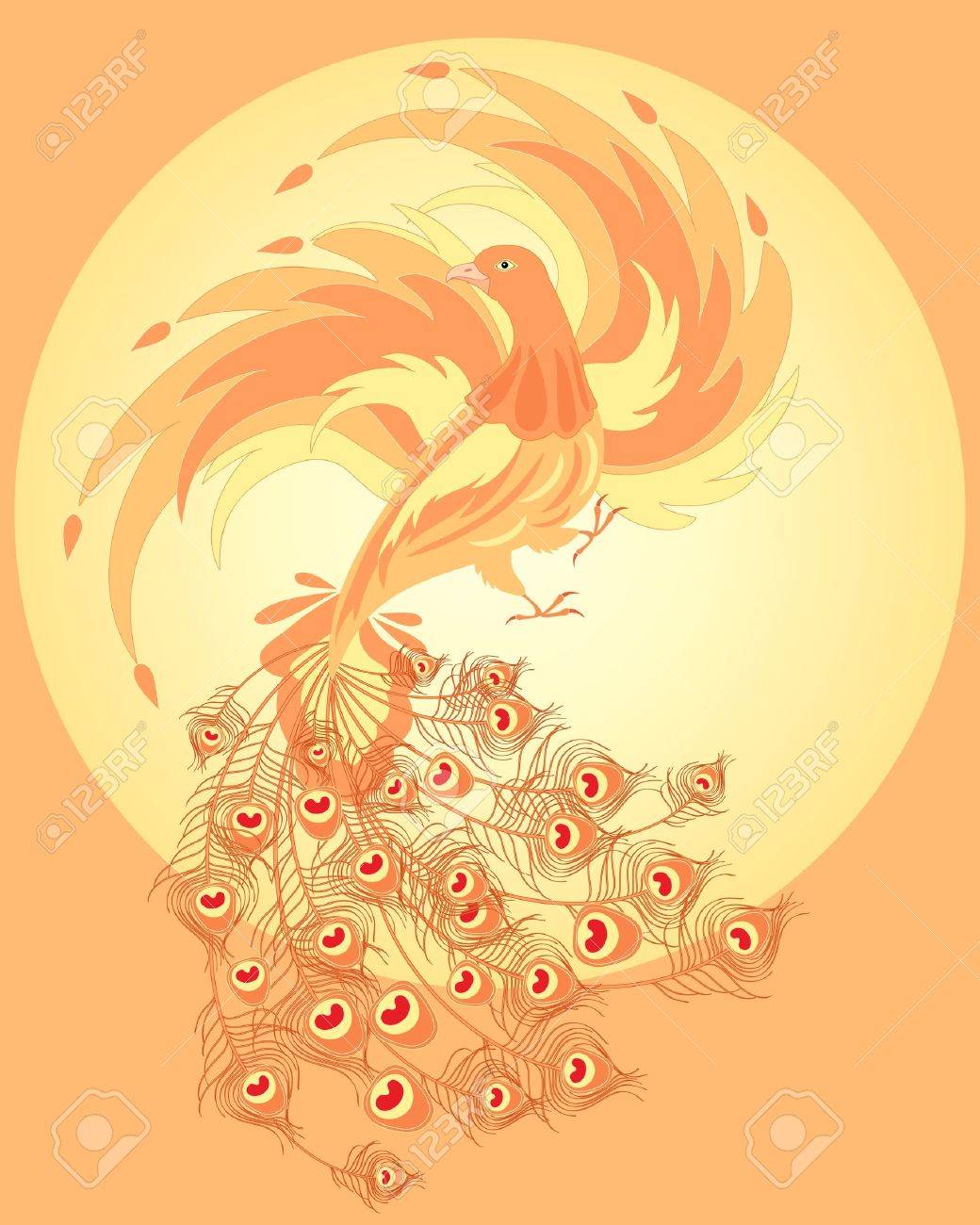 Una Ilustración De Un Pájaro De Fuego Con Alas De Fuego Y La Cola Del Pavo Real Contra Un Sol De Color Amarillo Brillante Ilustraciones svg, vectoriales, clip art vectorizado libre de