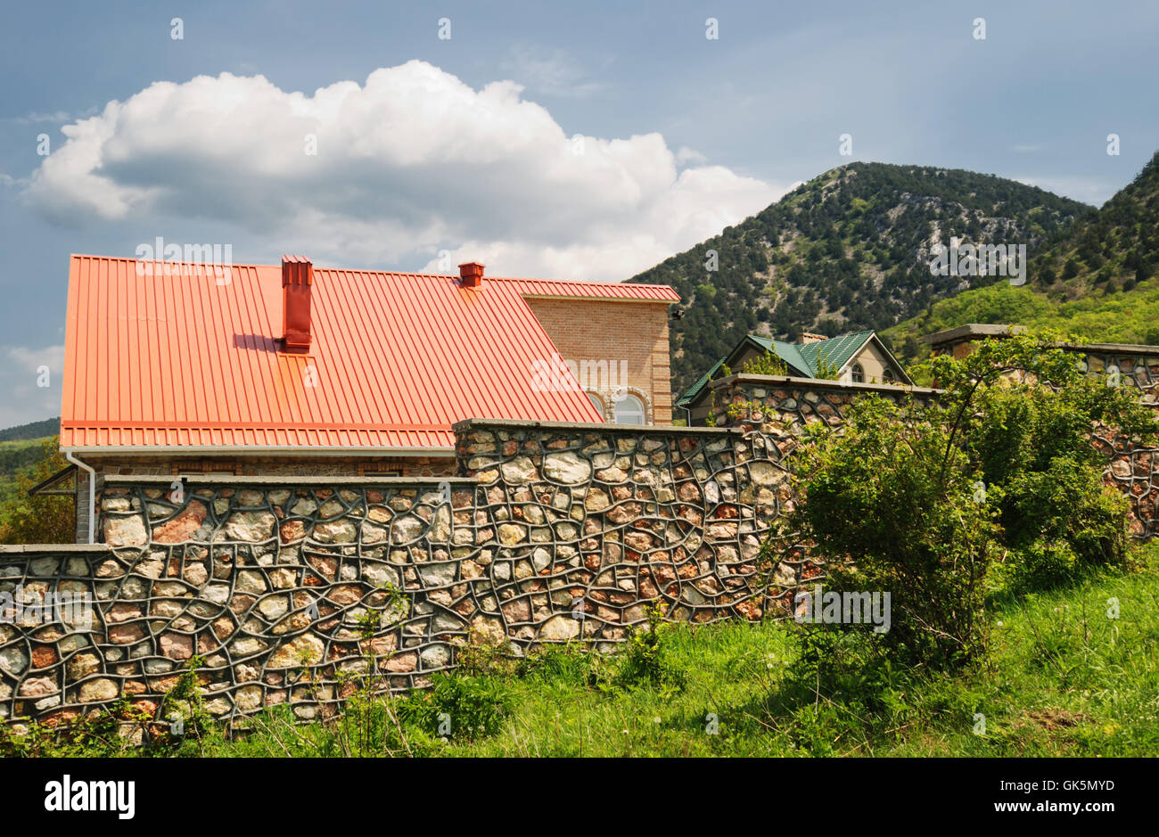 La casa con techo de tejas. La casa con aleros, ventanas y techo de tejas, equipado con desbordamiento Fotografía de stock - Alamy