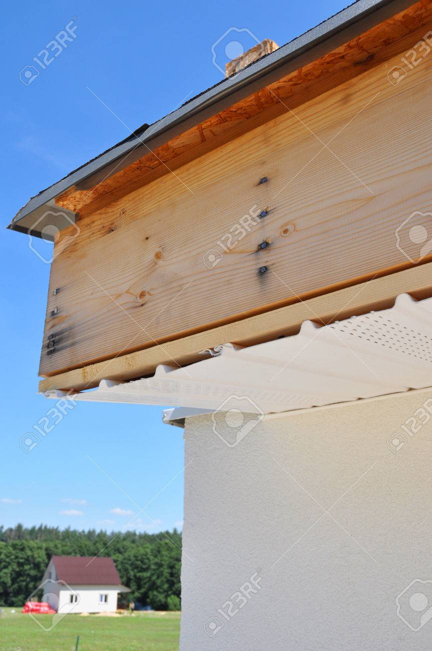 Instalar Aleros, Tablas De Sofito, Fascias En La Construcción De Techos De Casas Nuevas Fotos, retratos, imágenes y fotografía de archivo libres de derecho. Image 120937640