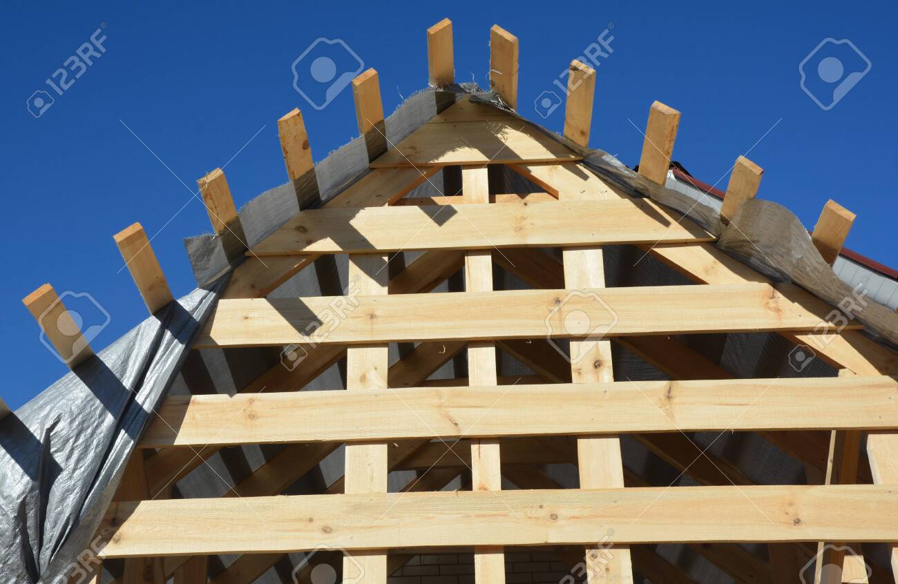 Casa De Construcción De Techos Con Vigas De Madera, Cerchas, Aleros Fotos, retratos, imágenes y fotografía de archivo libres de derecho. Image 133235051