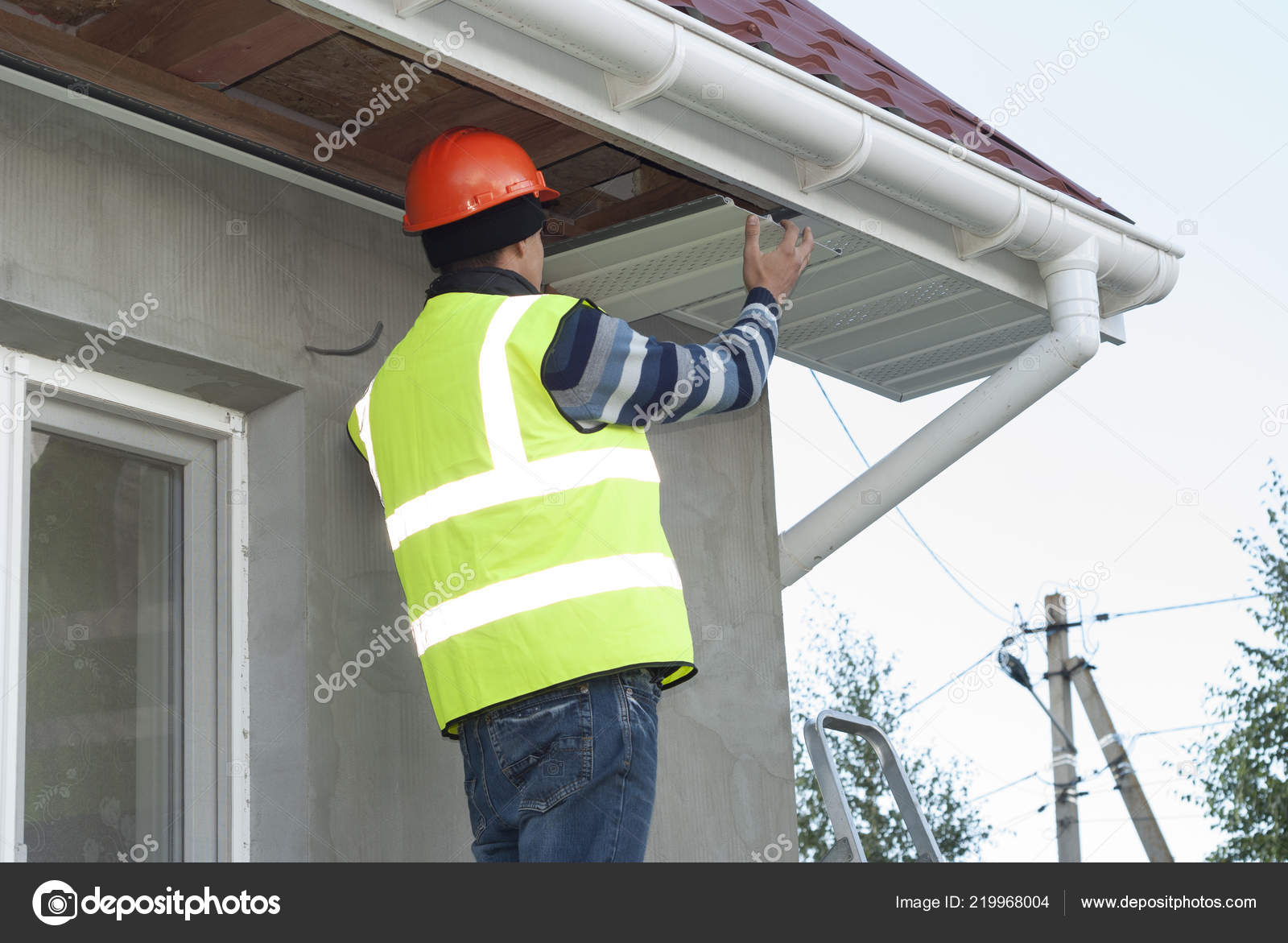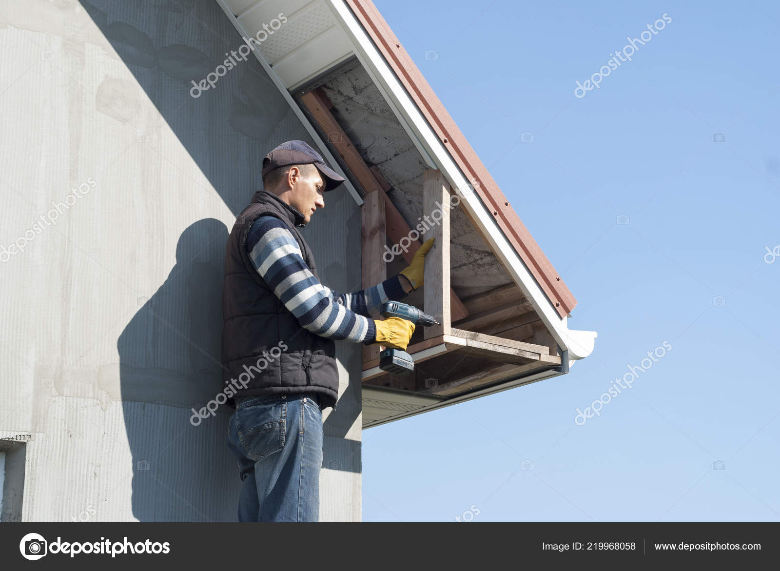 Reparación E Instalación De Aleros De Techo De Casa Plafones Y Tableros De La Fascia Foto de stock y más banco de imágenes de Reemplazo - iStock