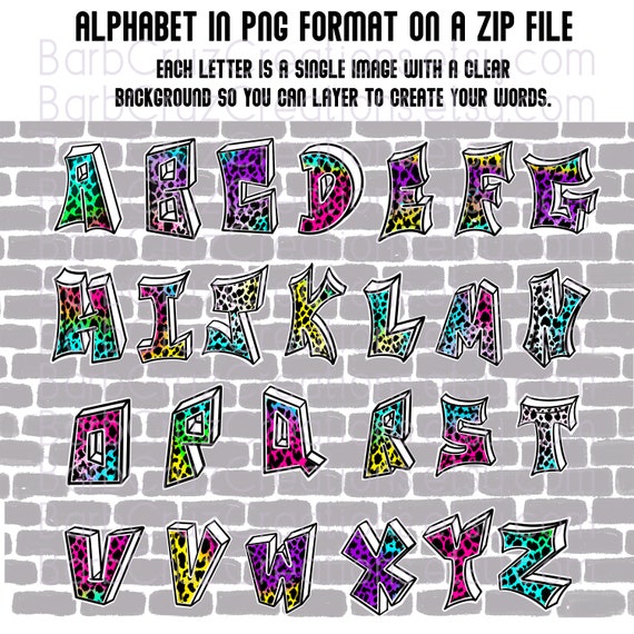 Estampado de leopardo, Colorido, Letras de graffiti, Alfabeto de aerógrafo en cursiva, Fuente de aerógrafo, Diseño de sublimación, Descarga digital, png, mayúsculas - Etsy México