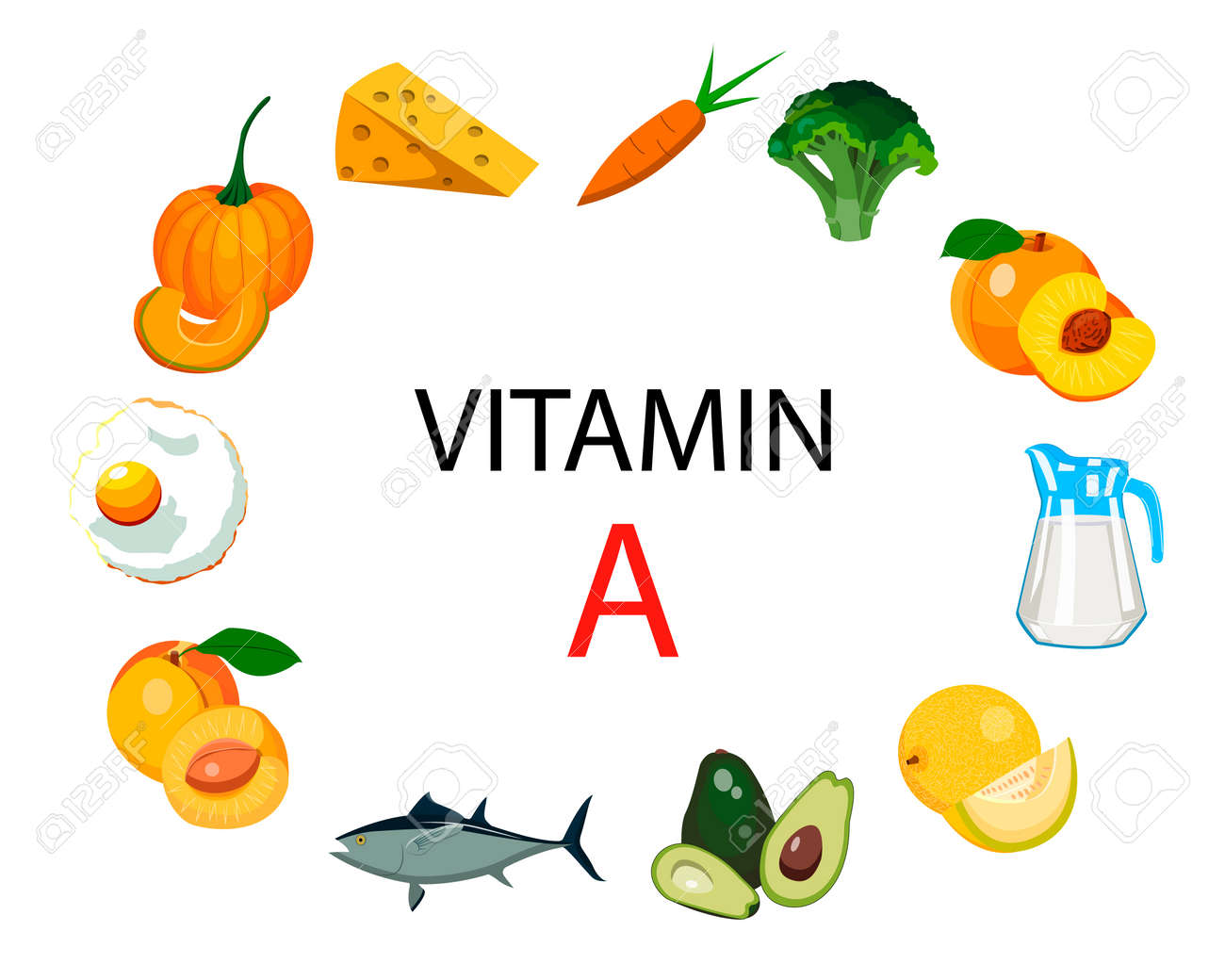 Alimentos ricos en vitamina a. ilustración vectorial con alimentos saludables ricos en vitamina a. recolección de alimentos orgánicos 5391021 Vector en Vecteezy