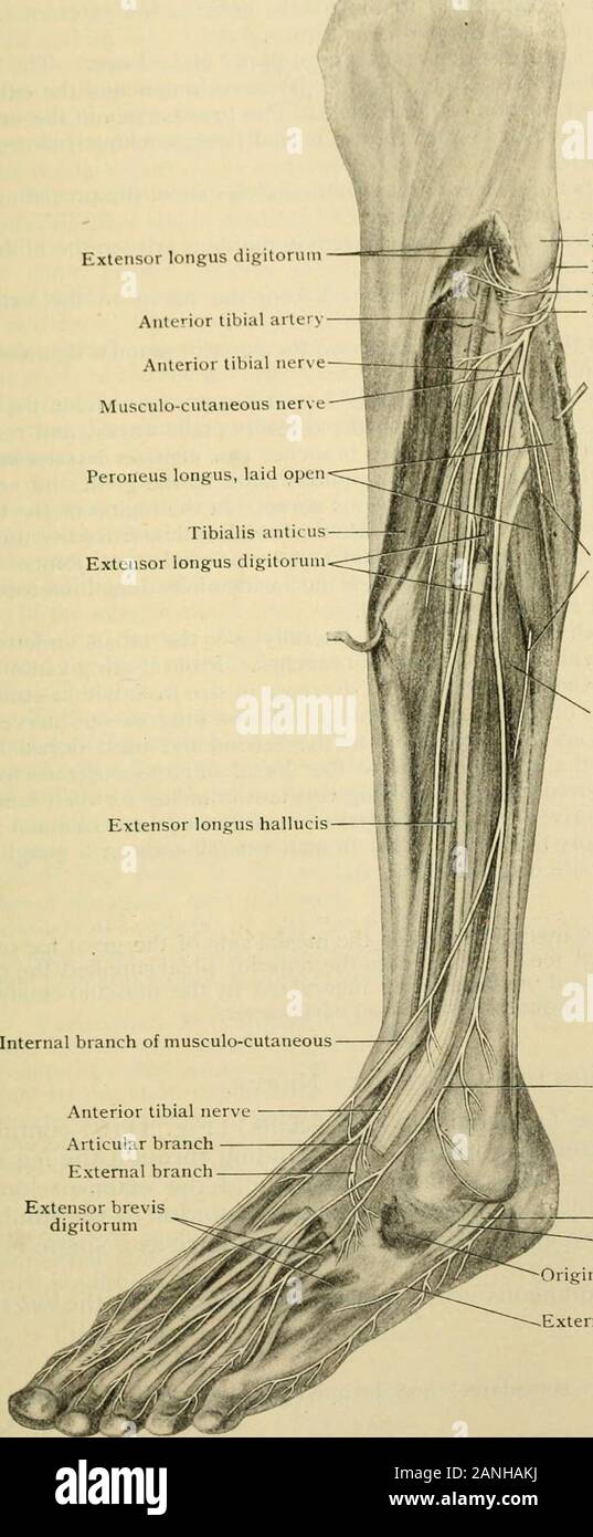 Anatomía descriptiva y aplicada. Anatomía. 526 Los músculos y la fascia quitar la fascia, dividiéndolo en la misma dirección que el tegumento, exceptuando el tobillo opuesto, donde todo debe estar a