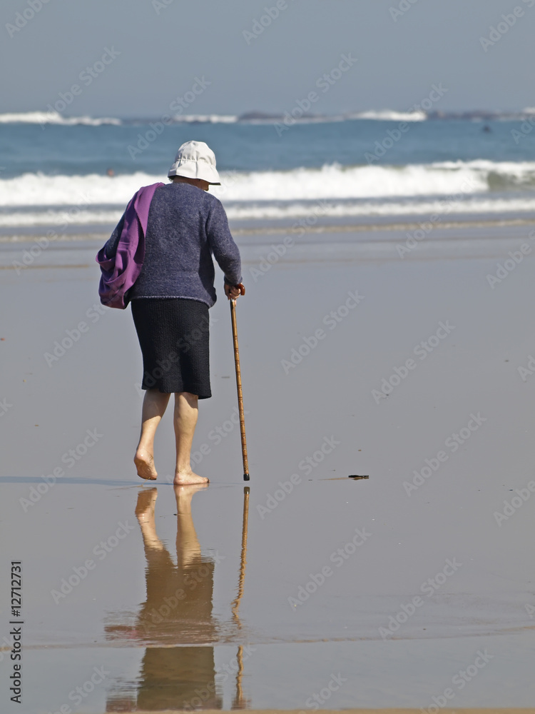 Anciana con bastón caminando por la playa Stock-Foto | Adobe Stock