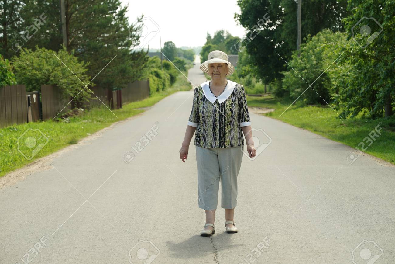Vieja Mujer Madura Caminando En El Camino En El Día Soleado. Emociones Positivas En El Estilo De Vida Fotos, retratos, imágenes y fotografía de archivo libres de derecho. Image 89283865