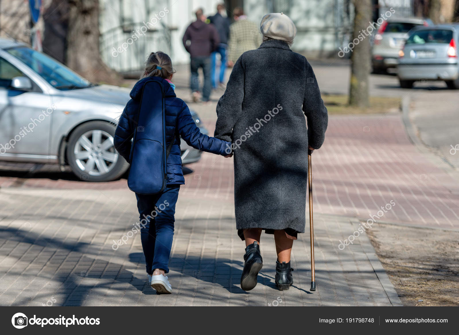 Una anciana caminando por la calle con un bastón y una niña pequeña va con ella. Vista desde atrás .: fotografía de stock © askoldsb #191798748 | Depositphotos