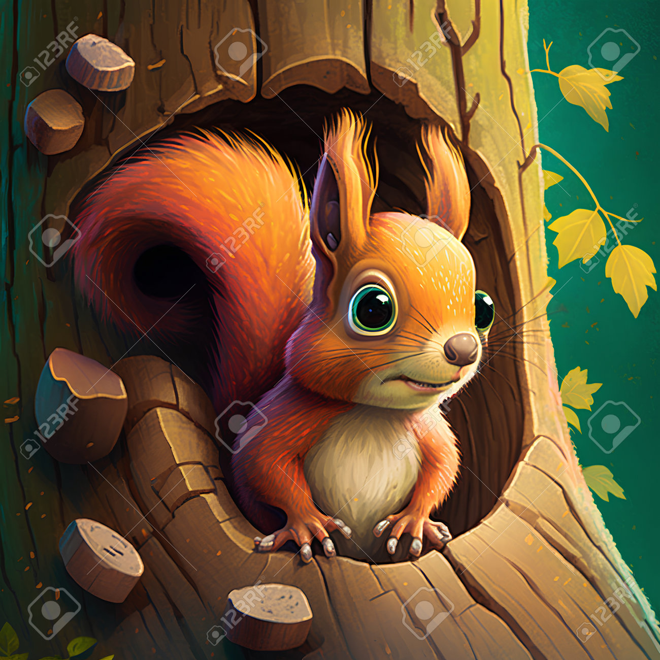 Escena De Dibujos Animados Con Pequeña Ardilla En El Hueco De La ...