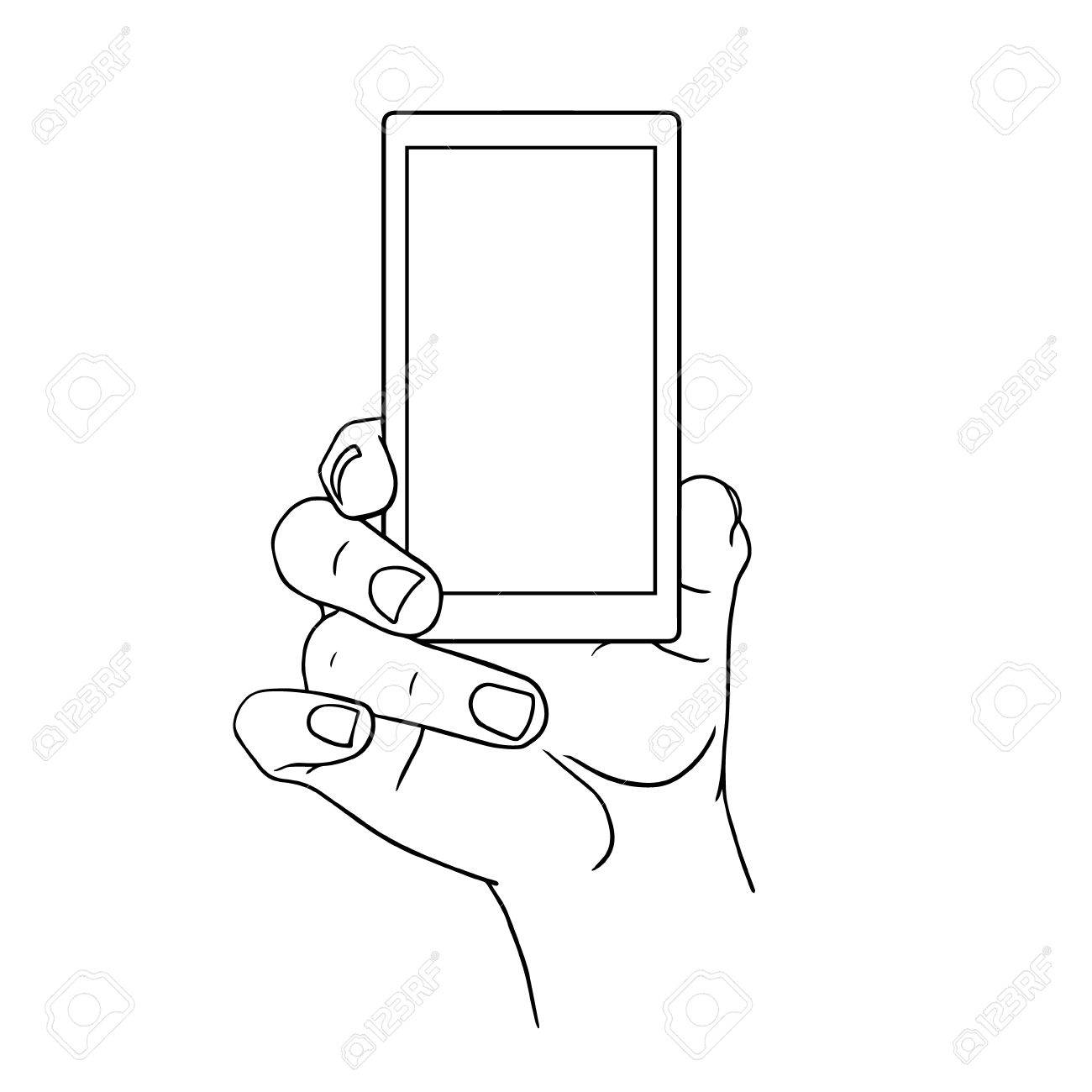 Mano Que Sostiene Móvil, Brazo Con Celular, Línea Dibujo Del Arte ...