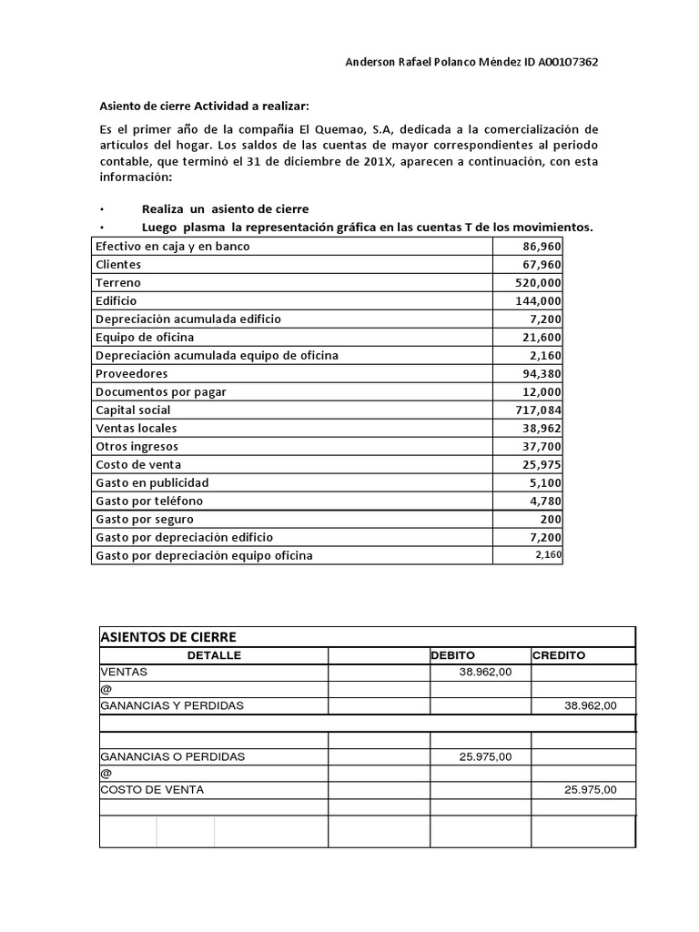 Unidad.4 Asiento De Cierre Paul Garcia - “Asiento De Cierre” Es el primer año de la compañía El - Studocu