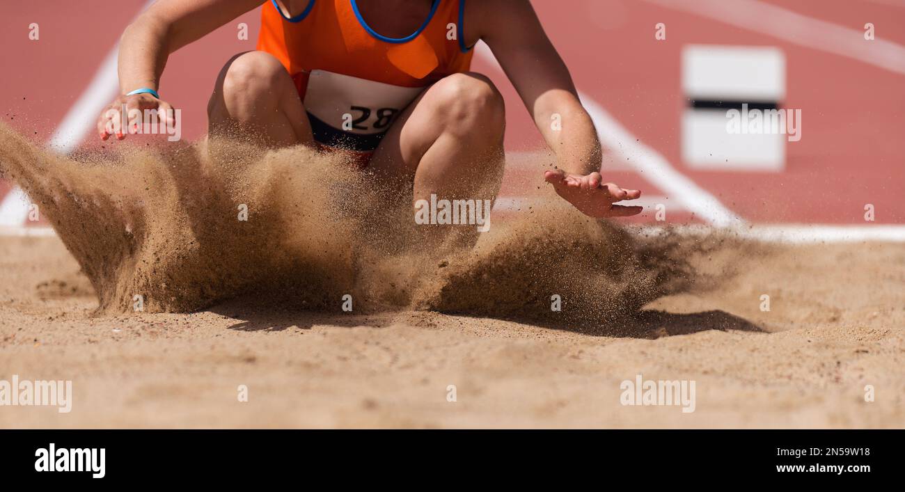 Atleta femenino salto largo aterrizaje spray de arena, aterrizaje en salto largo en pista y campo Fotografía de stock - Alamy
