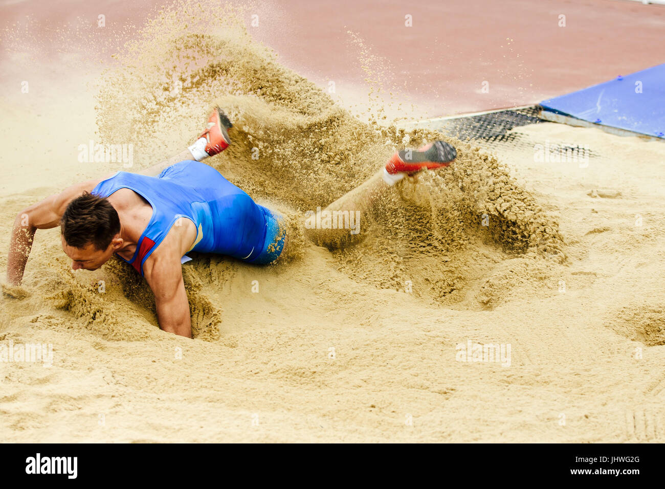 Salto en largo varones aterrizar en la arena un spray durante el campeonato de Ural en atletismo Fotografía de stock - Alamy