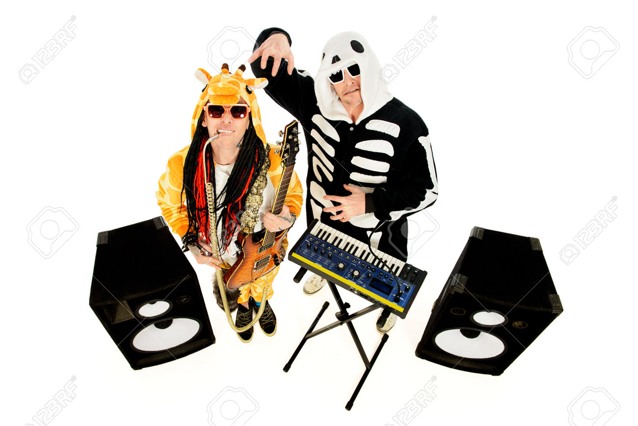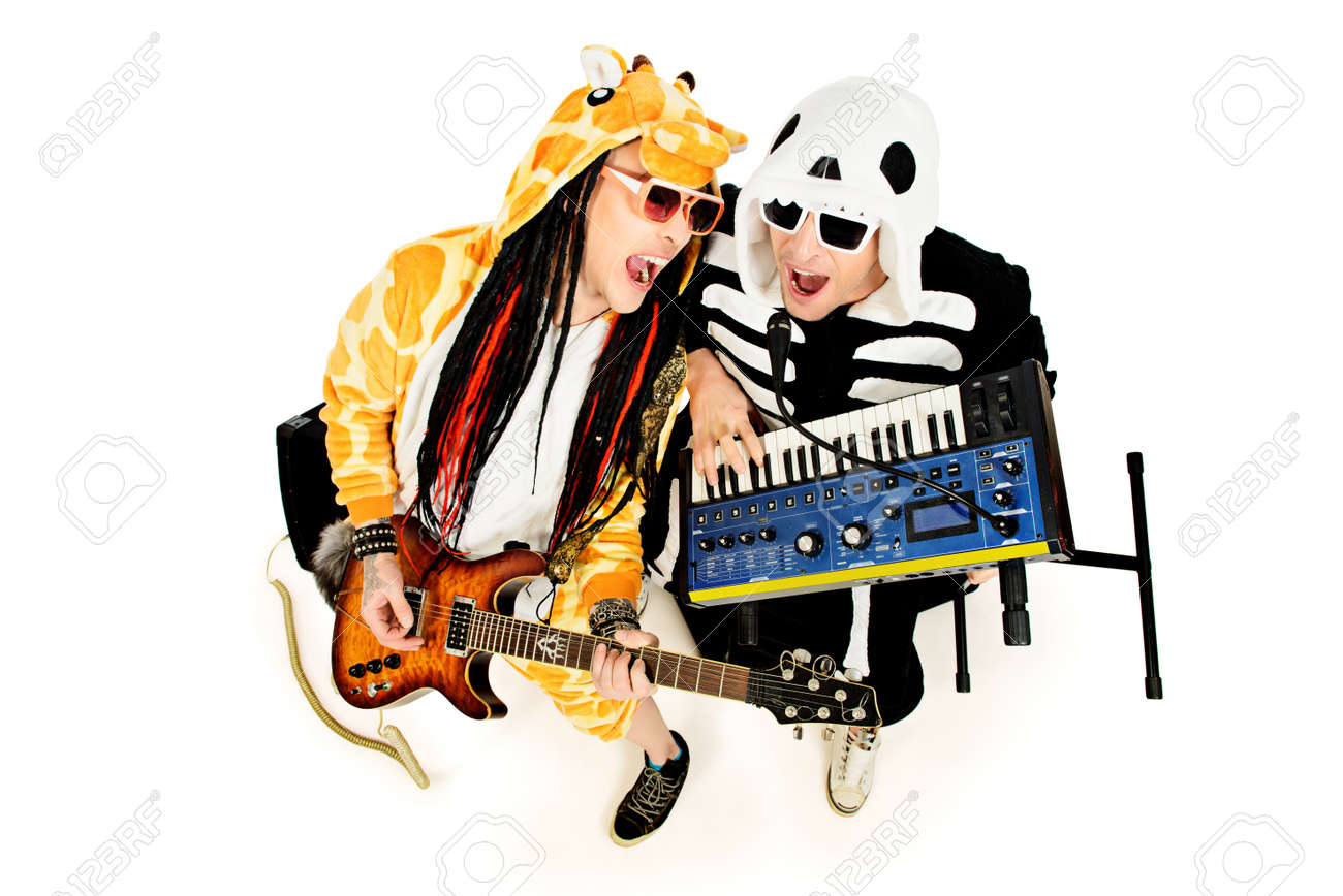 Banda De Rock En Trajes De Esqueleto Y La Jirafa Que Juega El Sintetizador Y La Guitarra Eléctrica Y Canto. Espectáculo De Música. Halloween. Aislado En Blanco. Fotos, retratos, imágenes y fotografía