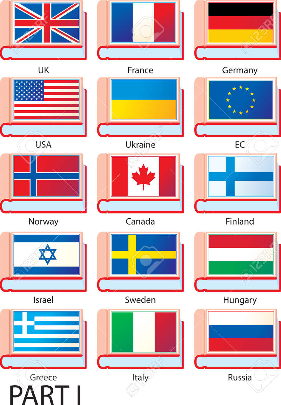 Флаги Европы, Америки И Азии На Обложках Словарей С Названиями Стран. Клипарты, SVG, векторы, и Набор Иллюстраций Без Оплаты Отчислений. Image 64592199