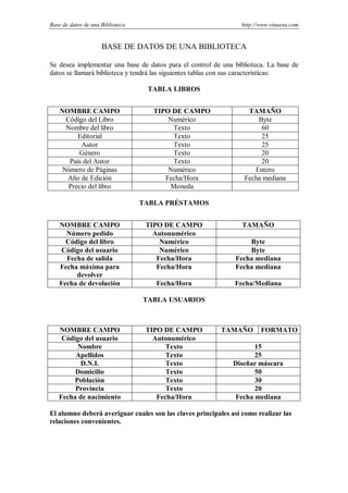 Access biblioteca - BASE DE DATOS DE UNA BIBLIOTECA Se desea implementar una base de datos para el - Studocu
