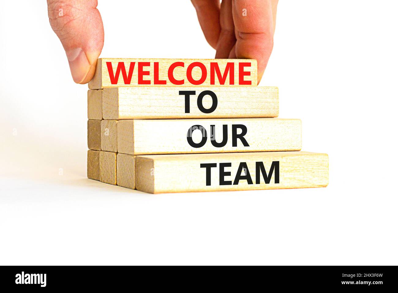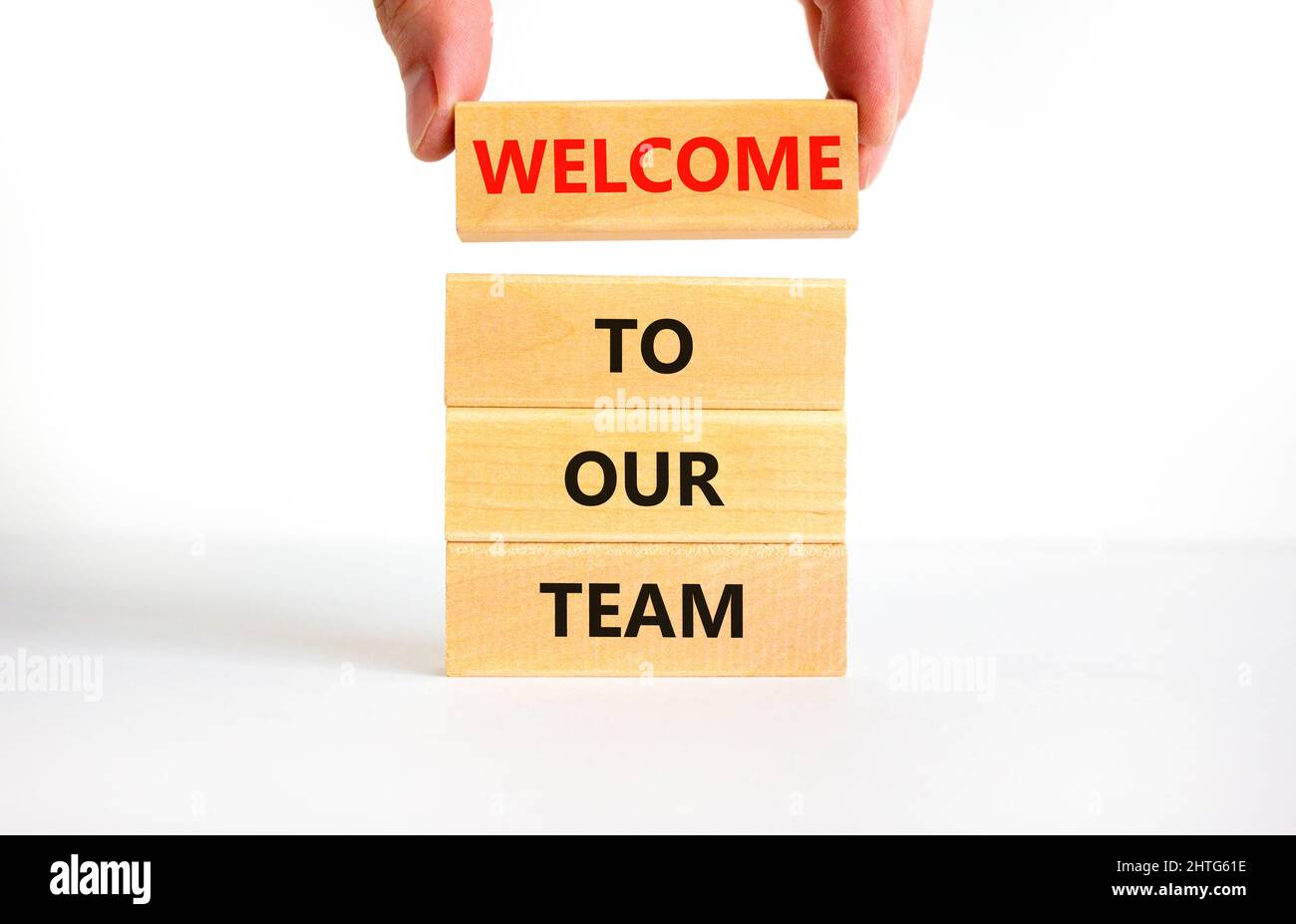 Bienvenido al símbolo de nuestro equipo. Concepto de palabras Bienvenido a nuestro equipo en bloques de madera sobre un hermoso fondo blanco. Mano de empresario. Negocios, motivación Fotografía de stock - Alamy