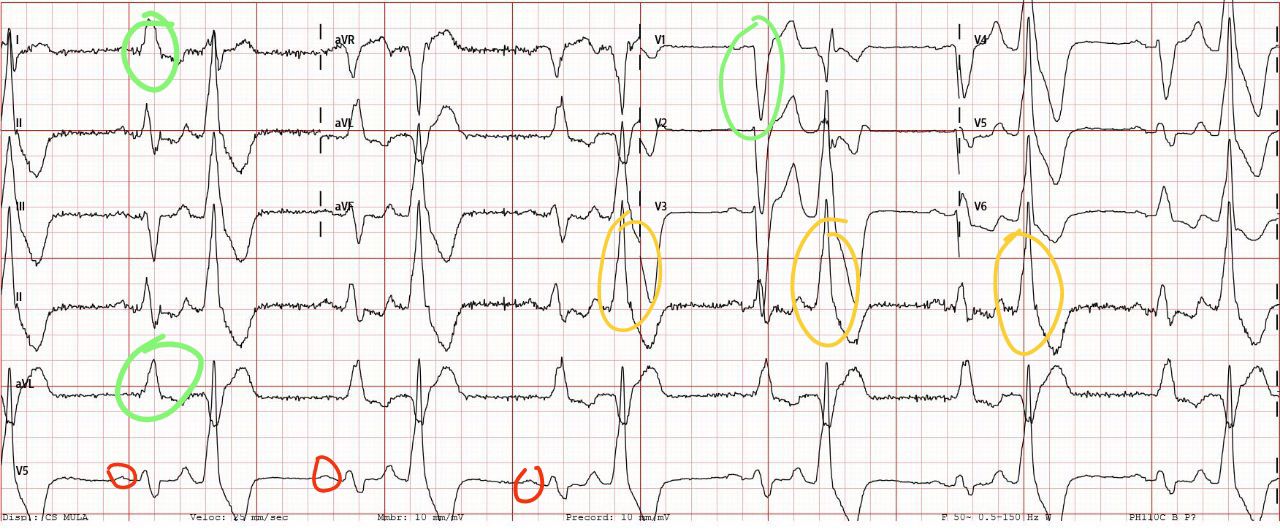 Proyecto CarPriMur on X: "👏Efectivamente se trata de BCRI y bigeminismo ventricular. 🔹Ondas p en rojo. 🔹Latidos conducidos en verde. Veis qrs ancho, R monofásica en I y aval más rS en