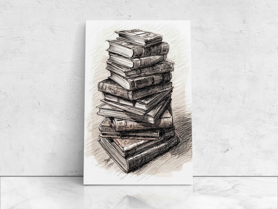 Pila de libro Dibujo expresivo, Ilustración digital sobre lienzo, Listo para colgar, Decoración de biblioteca, Decoración de oficina - Etsy México