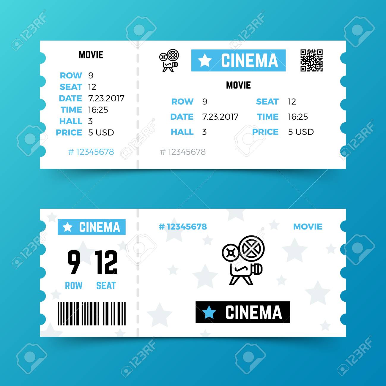 Шаблон билетов кино Дизайны вектора различных билетов кино с иллюстрациями видеокамер и других инструментов Иллюстрация вектора - иллюстрации насчитывающей знамена, график: 123669284