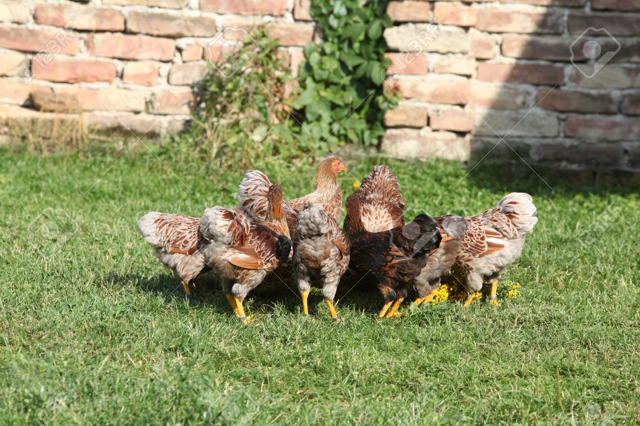 Gallinas y gallos seueltos en la naturaleza comiendo y libres con ...