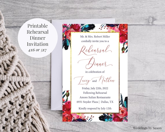 Cena de ensayo de boda 4x6 o 5x7 tarjetas imprimibles, tono joya floral y plumas, rojo, azul, borde de lámina de oro, invitación a fiesta de ensayo - Etsy México