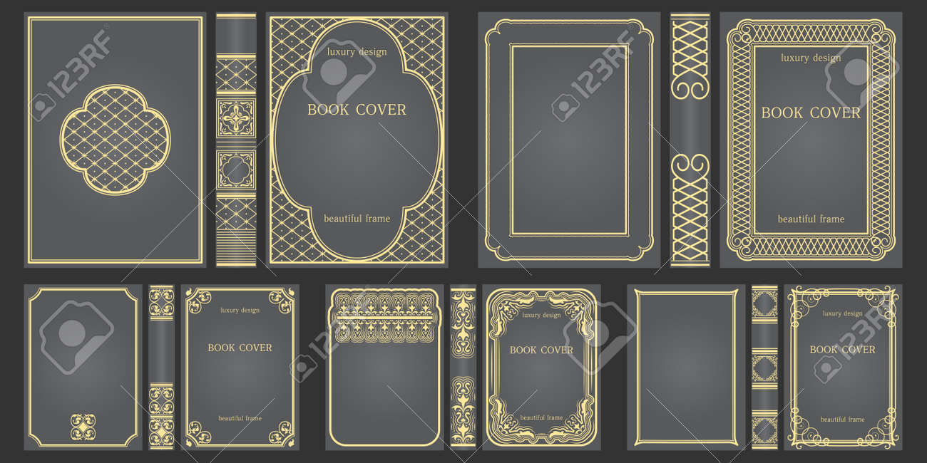 Conjunto De Plantilla De Diseño De Portada Y Lomo De Libros. Marcos O Bordes Antiguos Ornamentados Para Imprimir En Portadas De Libros. Marcos Retros. Diseño De Folleto Clásico. Portada De Presentación. Ilustración