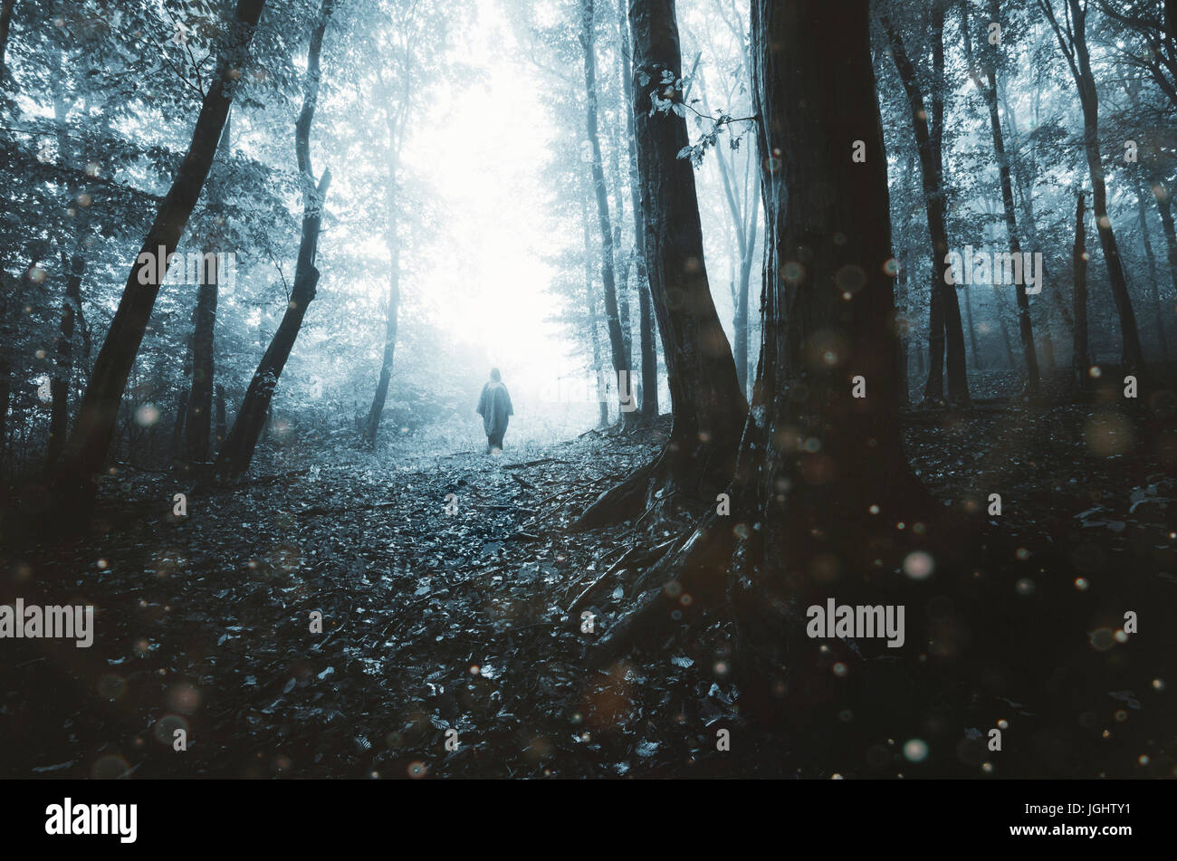 Oscuro bosque de miedo con la misteriosa figura fantasmal en la noche de Halloween Fotografía de stock - Alamy