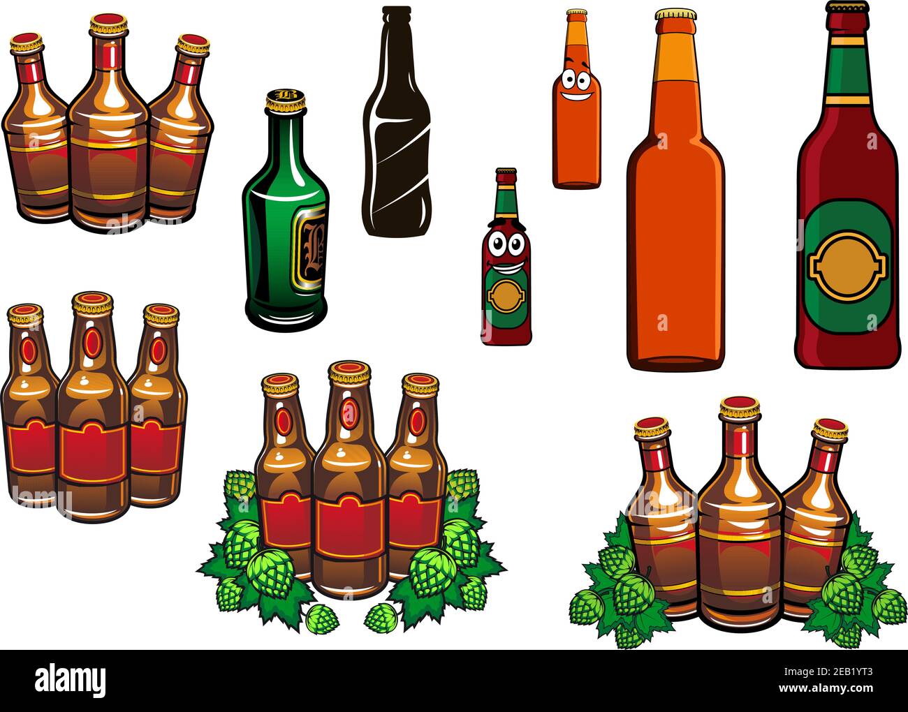 Botellas de cerveza con dibujos animados verde y marrón botellas de vidrio de cerveza, lúpulo, etiquetas en blanco y caras sonrientes graciosas para el diseño de bebidas alcohólicas Imagen Vector de stock -