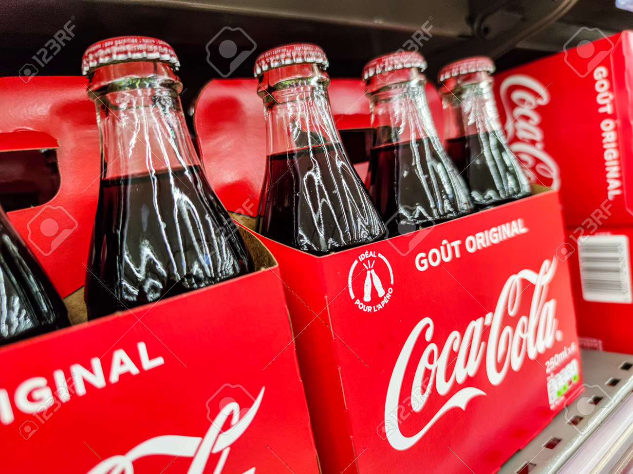 Puilboreau, Francia - 14 De Octubre De 2020: Enfoque Seleccionado En Una Colección De Botellas De Coca Cola Antiguas Y Antiguas En El Mercado Francés Fotos, retratos, imágenes y fotografía de archivo