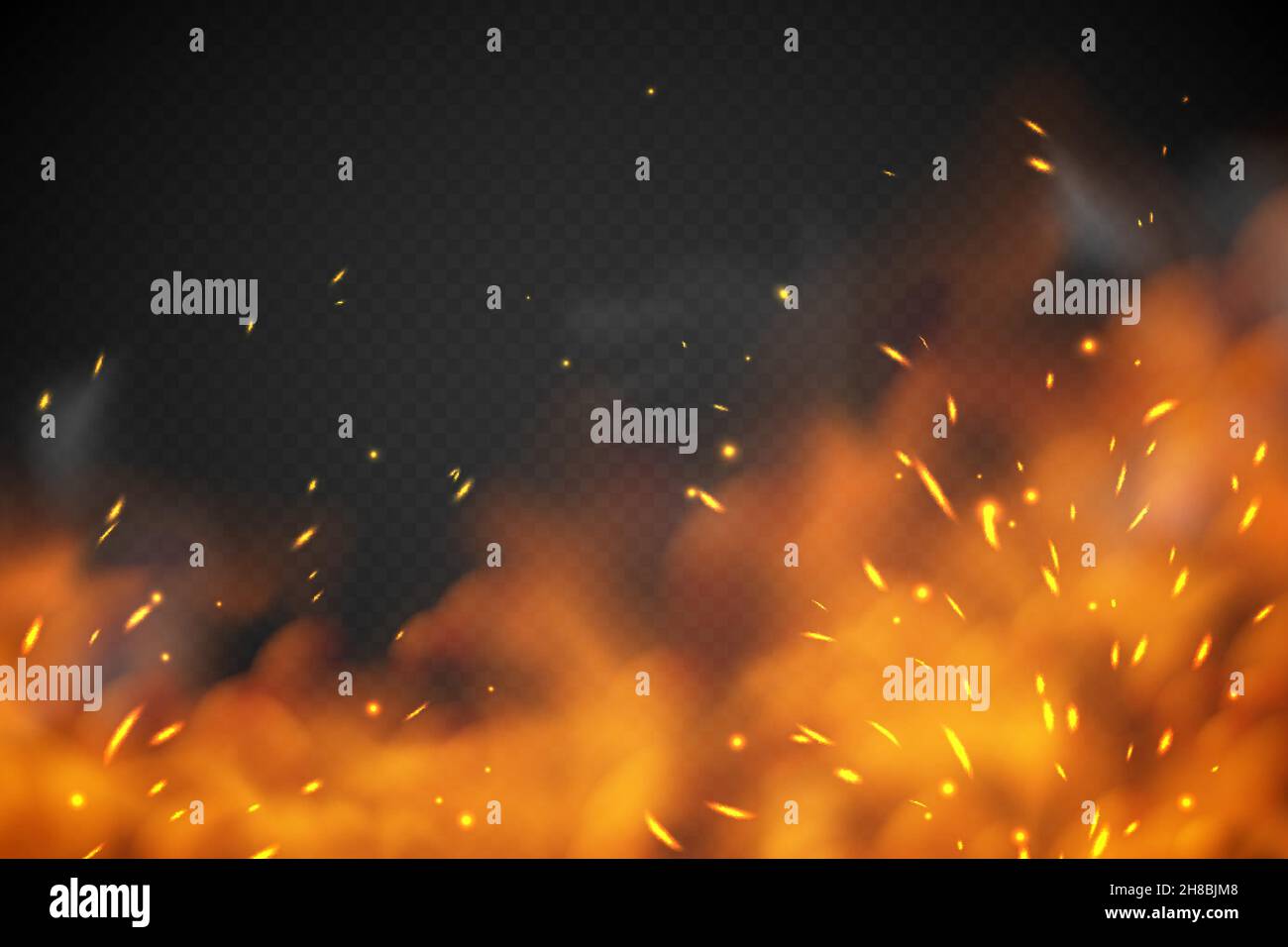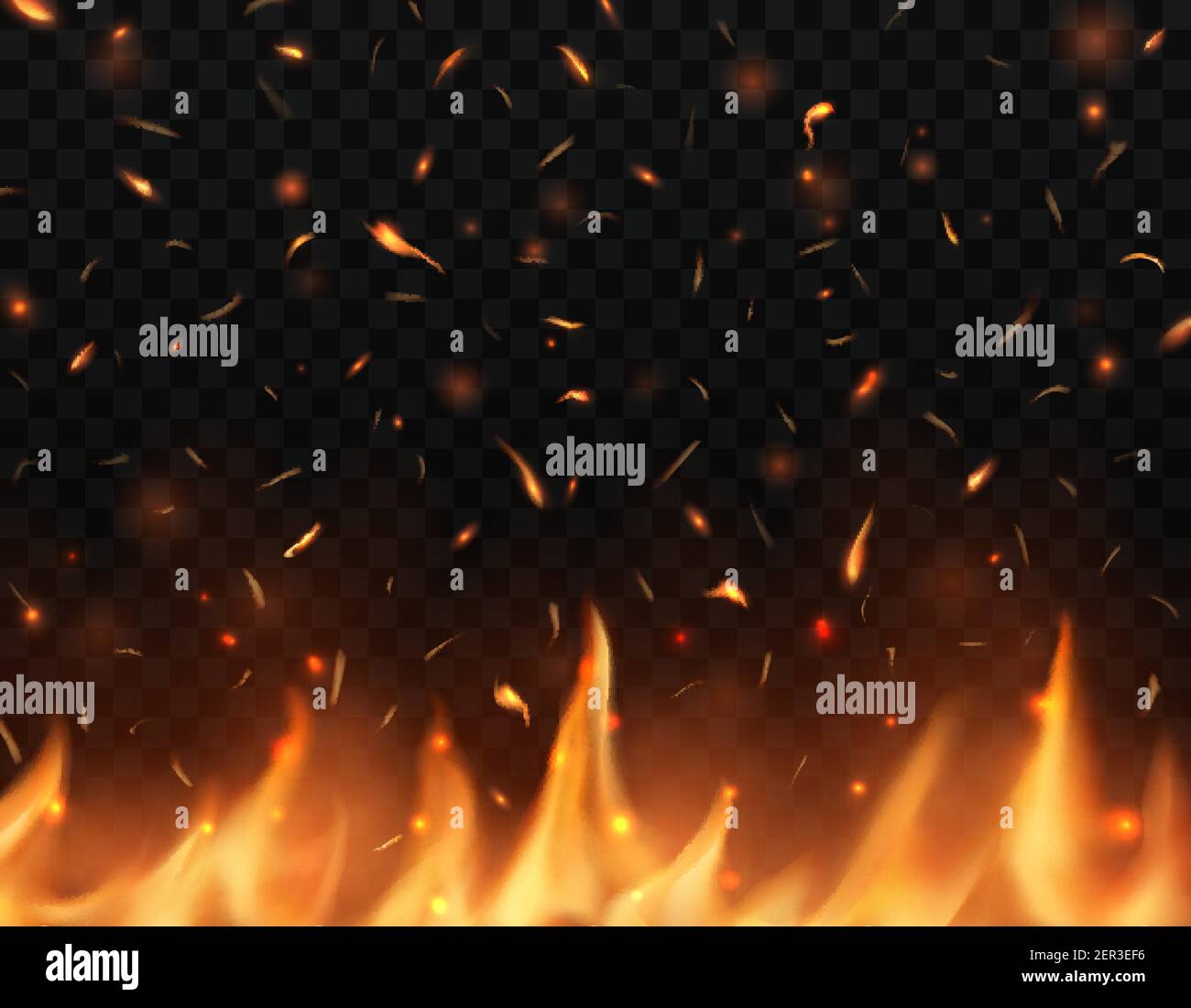 Lenguas de fuego realistas con chispas, resplandor vector llamaradas, llamas de fogata quemada con partículas volando, brasas y aliso. Quemando fuego 3D Imagen Vector de stock - Alamy