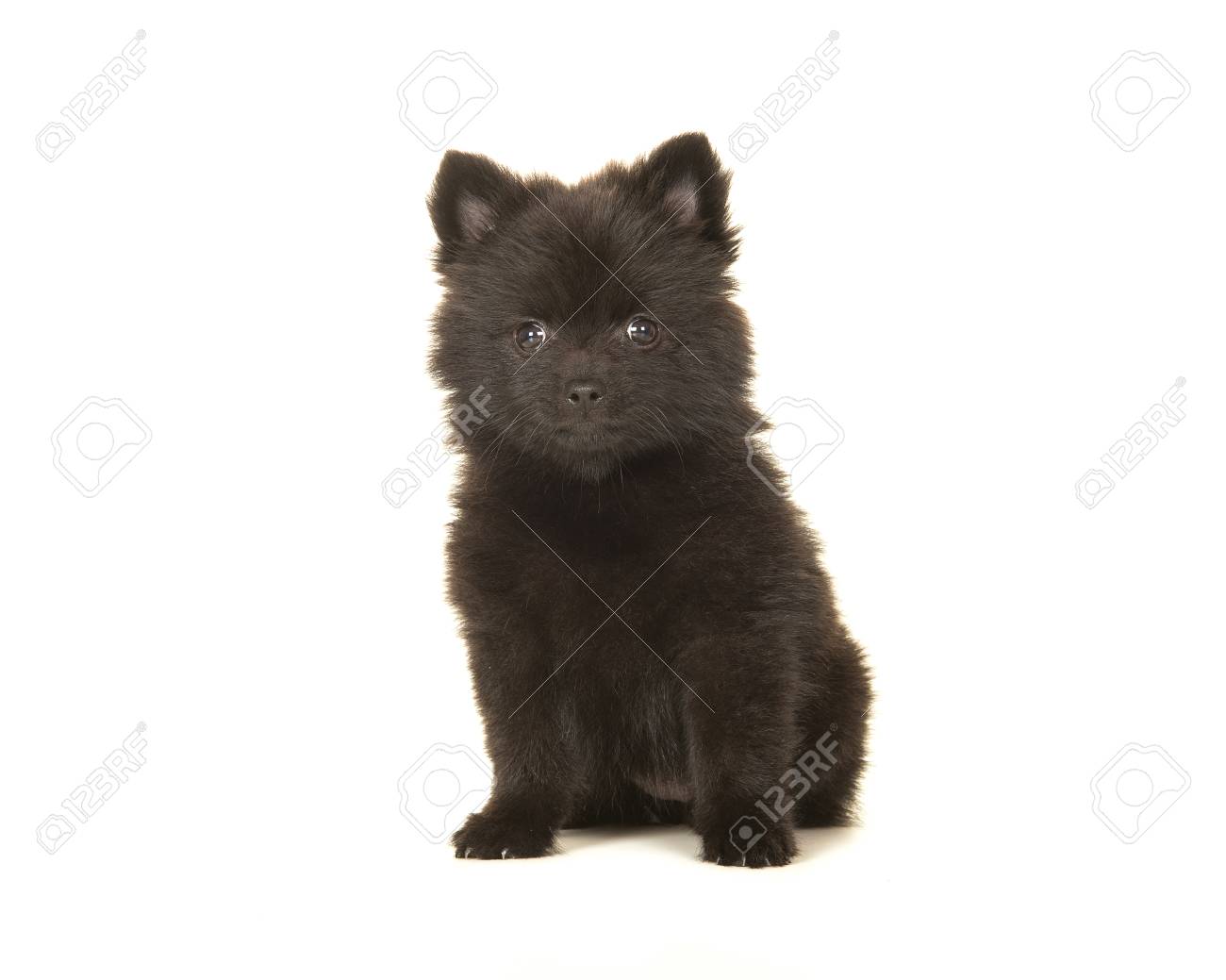 Linda Que Se Sienta Perro Pomerania Cachorro Negro Aislado En Un Fondo Blanco Frente A La Cámara Fotos, retratos, imágenes y fotografía de archivo libres de derecho. Image 65239783