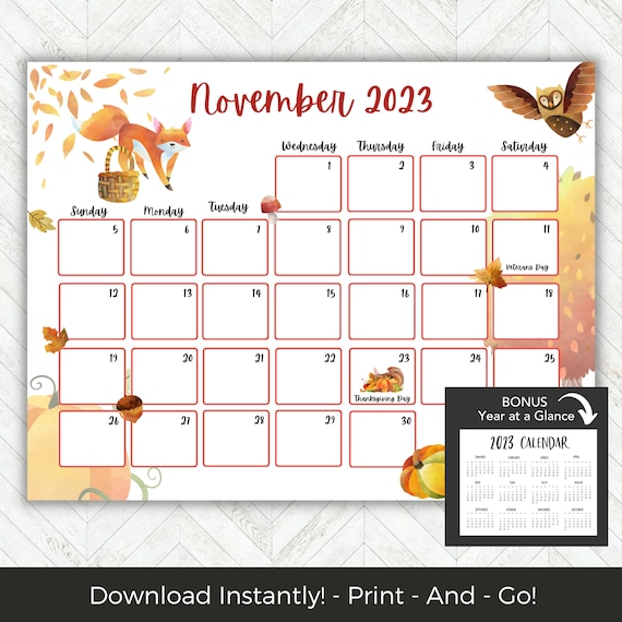 Calendario Noviembre 2023, Calendario Infantil Imprimible, Calendario 2023, Calendario Mensual Imprimible 2023, Calendario de Pared Calendario 2023 Imprimible - Etsy España