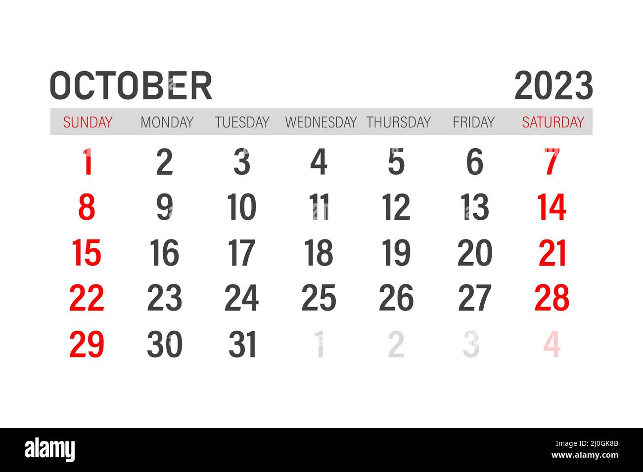 Plantilla de calendario para octubre de 2023. Diseño para el año 2023 de octubre. Planificador mensual imprimible. Diseño de calendario de escritorio. Comienzo de la semana el domingo Imagen Vector de stock - Alamy