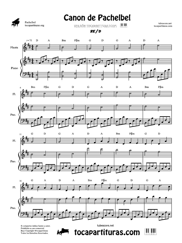 Tocapartituras: Canon de Pachelbel en Re (D) Partitura de Flauta, Violín, Saxofón Alto, Trompeta, Viola, Oboe, Clarinete, Saxo Tenor, Soprano Sax, Trombón, Fliscorno, chelo, Fagot, Barítono, Bombardino, Trompa o corno, Tuba...