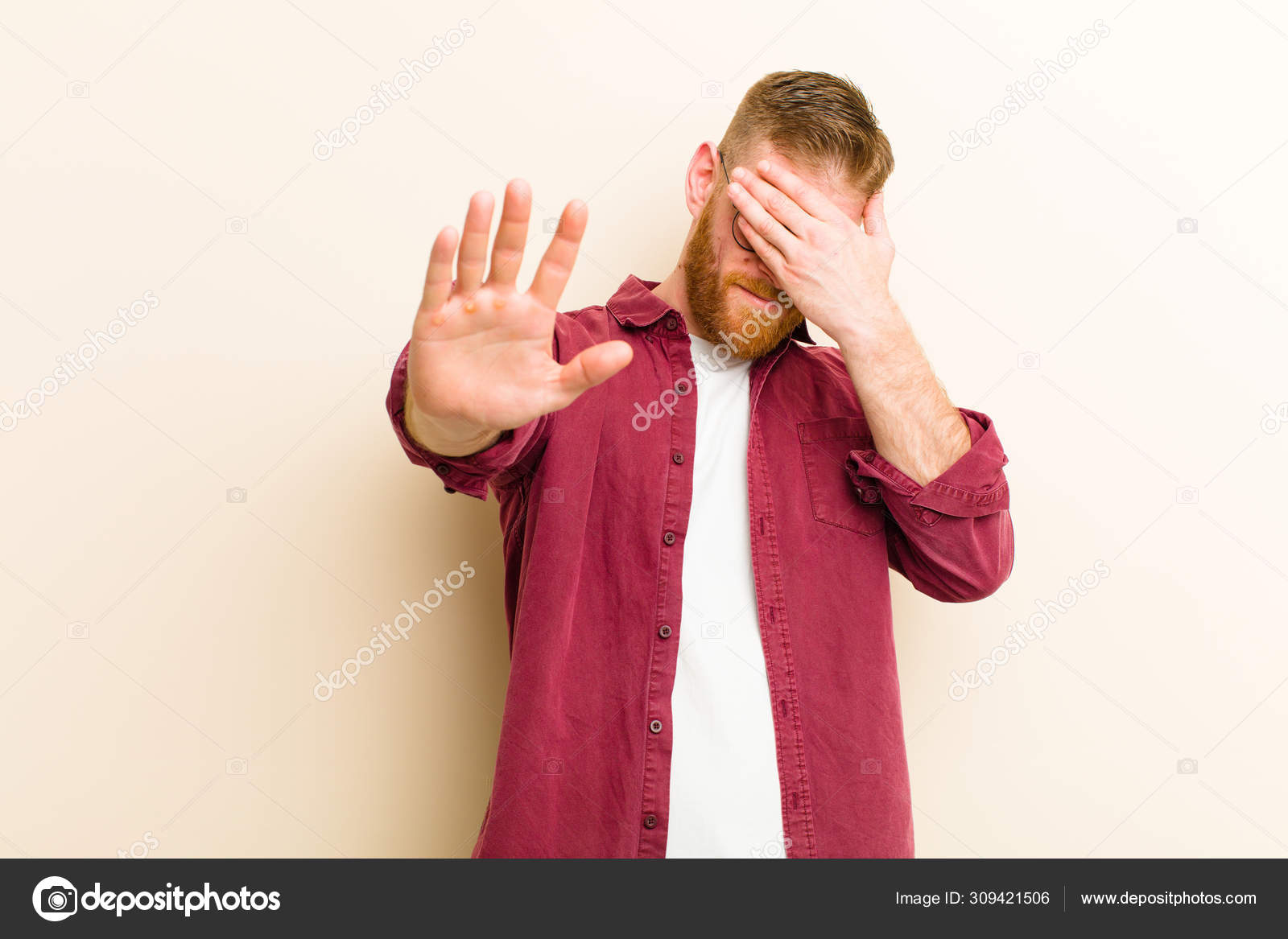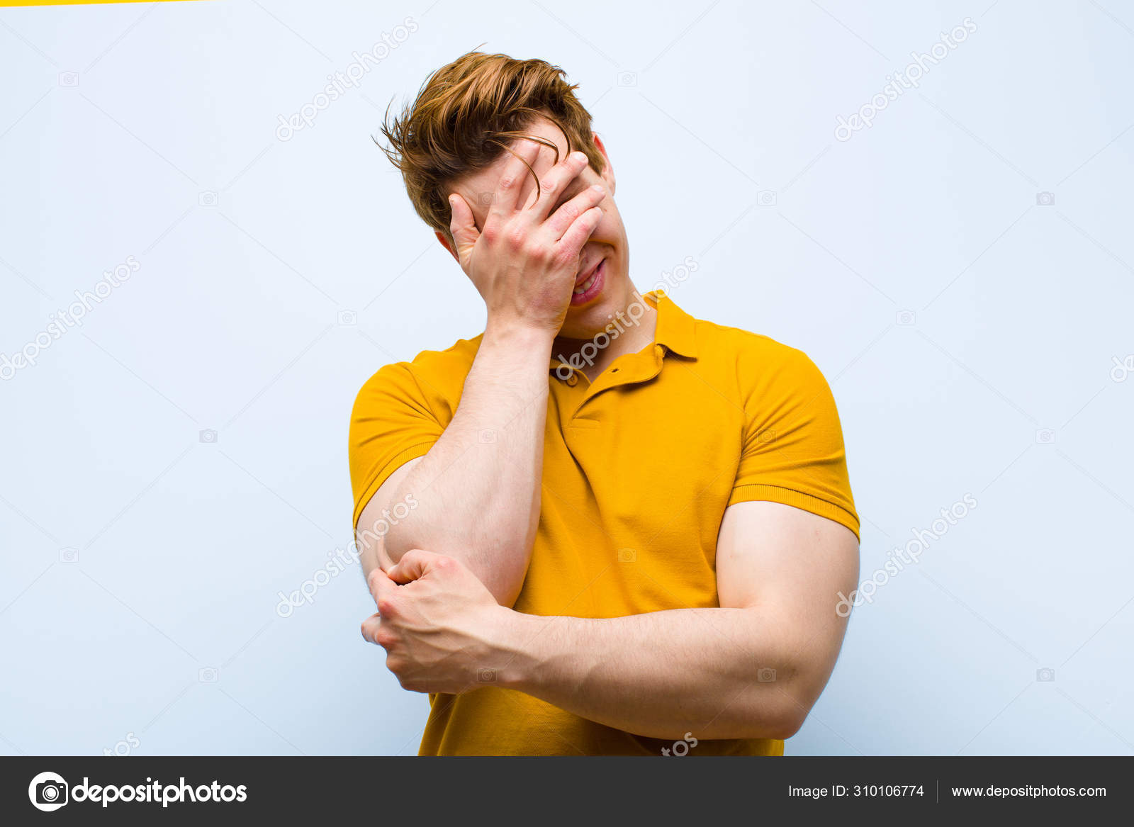 Joven empresario de cabeza roja mirando estresado, avergonzado o molesto, con dolor de cabeza, cubriéndose la cara con la mano pared naranja | Foto Premium