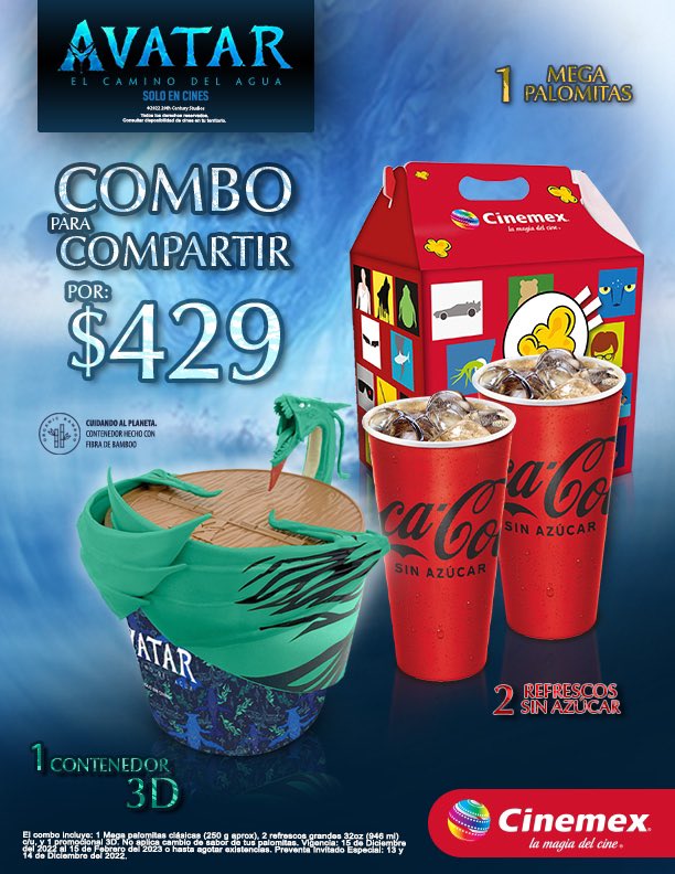 Cinemex on X: "1 Contenedor 3D de #Avatar + Dos refrescos sin azúcar + 1 Mega Palomitas = El combo perfecto 🤩 para disfrutar de Avatar: El Camino del Agua en Cinemex: