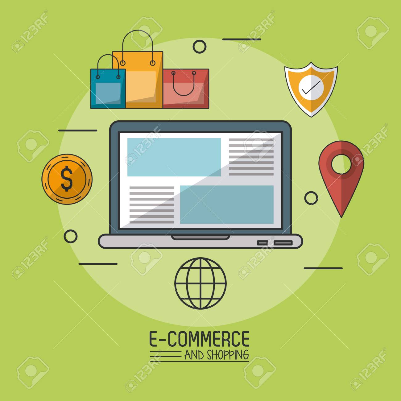 Cartel Colorido En Fondo Verde Del Comercio Electrónico Y Compras ...