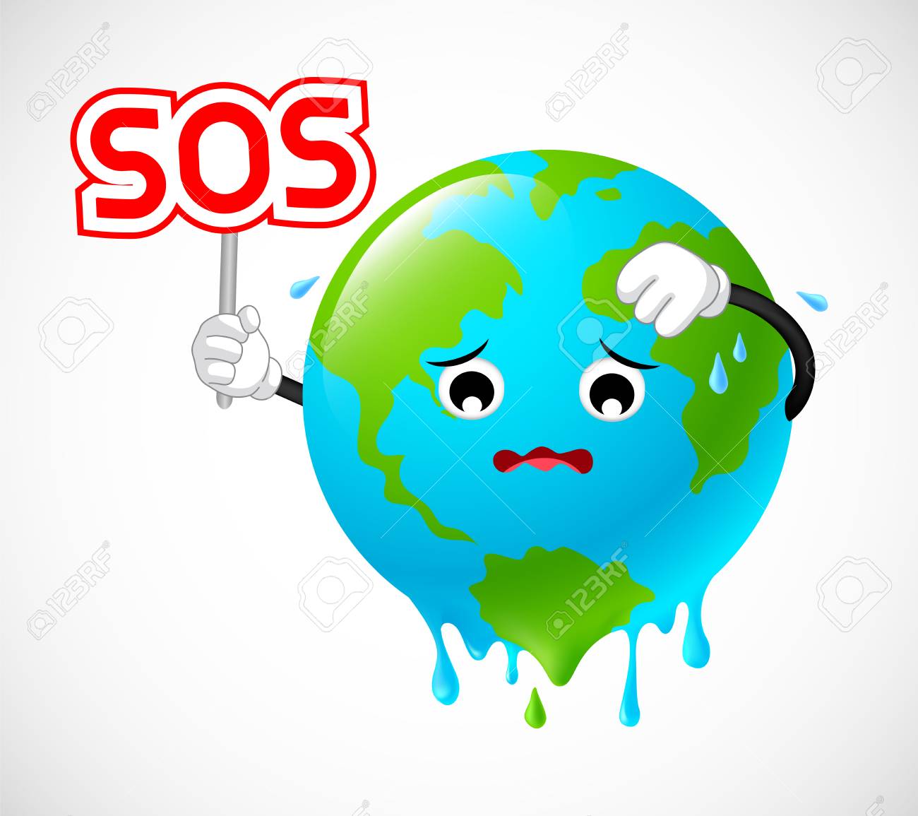 Para El Calentamiento Global. Carácter Del Planeta Tierra Con Cartel SOS. Ilustración Sobre Fondo Blanco. Ilustraciones svg, vectoriales, clip art vectorizado libre de derechos. Image 98211065