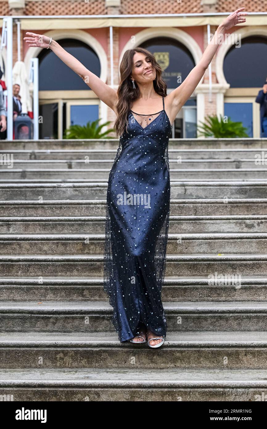Venice Lido, Italy. 29th Aug, 2023. Caterina Murino godmother of the 80th Venice International Film Festival poses for the photos at the beach of the Hotel Excelsior in Lido. (Photo by Mario