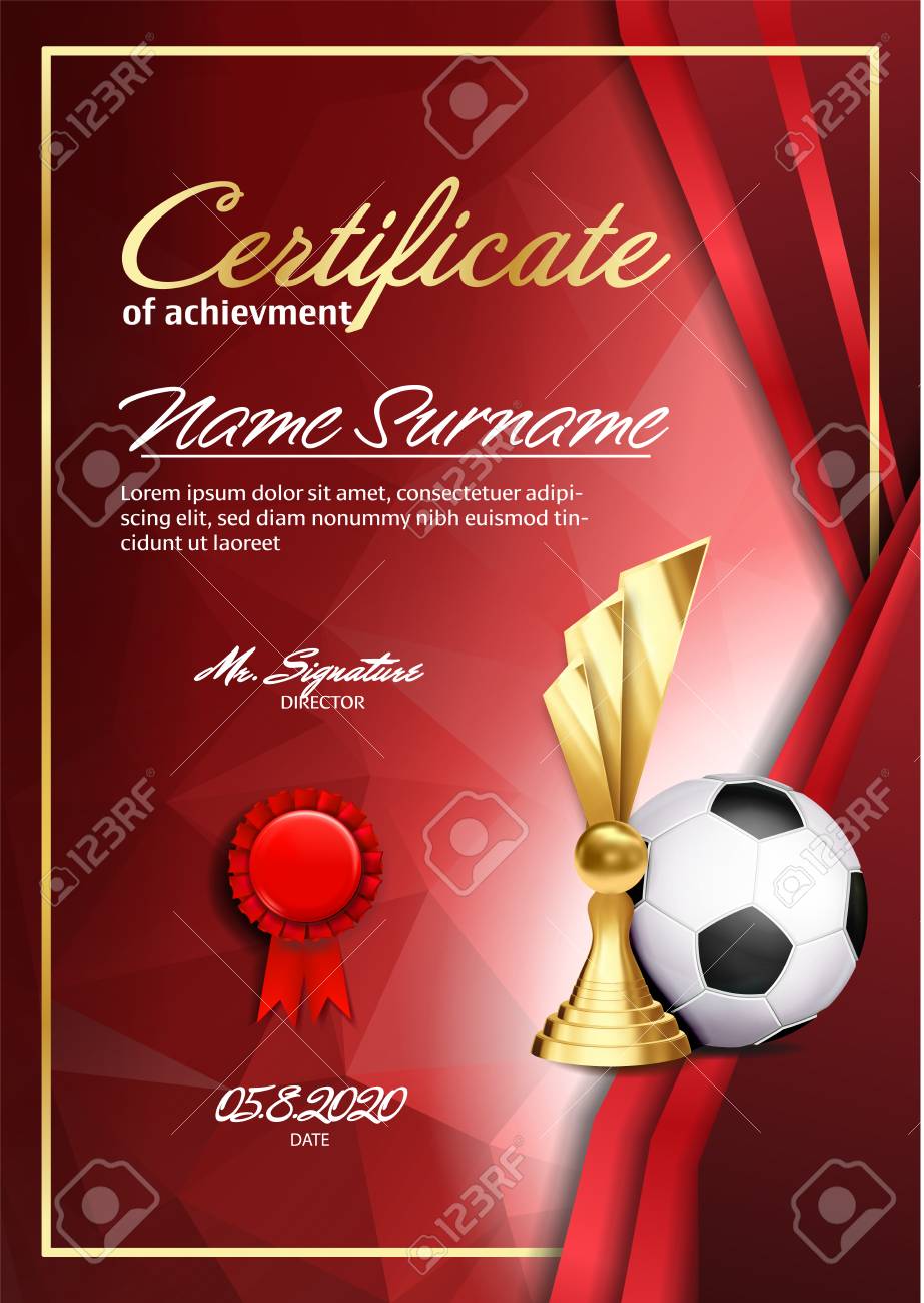 Diploma Certificado de fútbol con taza dorada Vector. El fútbol. Premio deporte Plantilla. Logro de diseño. Honor de fondo. A4 vertical. Ilustración Imagen Vector de stock - Alamy
