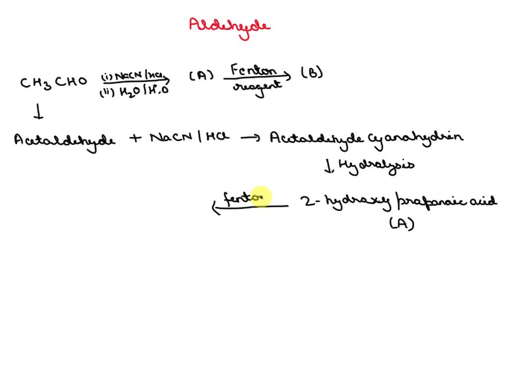 SOLVED: In the given reaction, the product (B) is: CH3CHO [(ii)H2O/H^+/Δ] (i)NaCN/HCl (A) [reagent] Fenton (B) A. acetic acid B. oxalic acid C. pyruvic acid D. citric acid