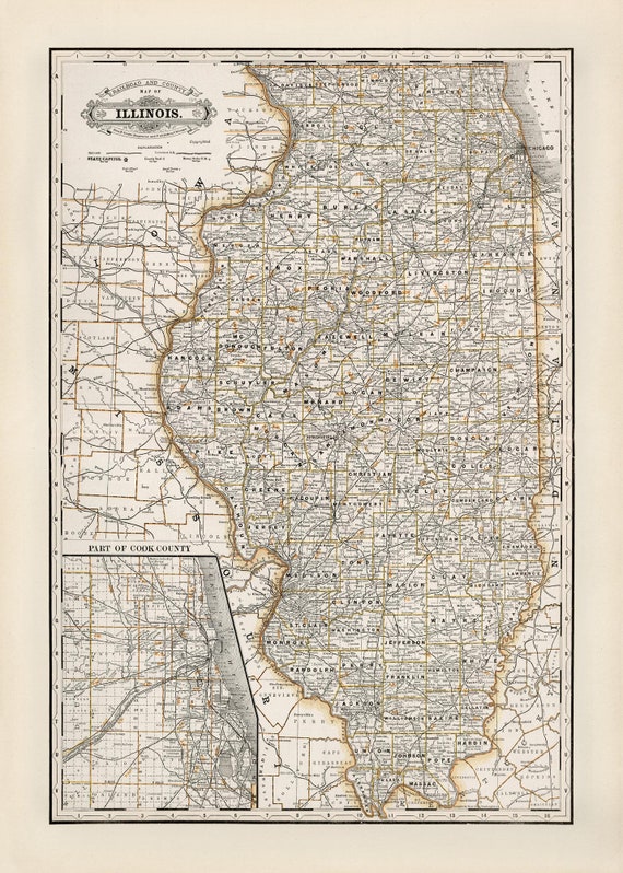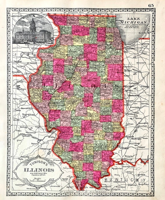 Mapa del estado de Illinois, mapa original del atlas de Tunison de 1889, Chicago, tierra de Lincoln, Springfield - Etsy España