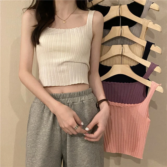 Camisetas cortas de punto con borde enrollado para mujer, camisetas sin mangas coreanas, Tops cortos ajustados informales para chicas - AliExpress