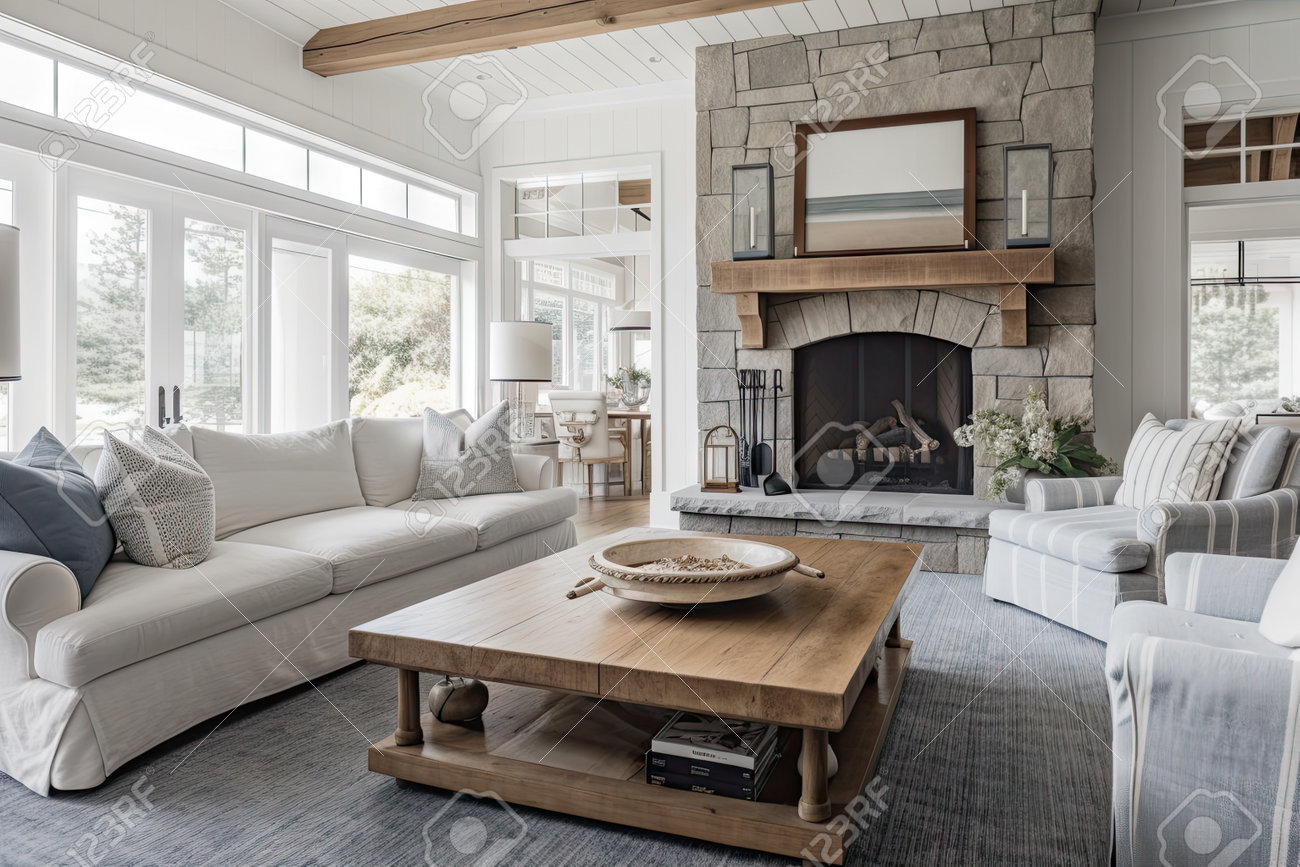 Acogedora Sala De Estar Con Chimenea De Piedra Y Decoración Costera Rústica Creada Con IA Generativa Fotos, retratos, imágenes y fotografía de archivo libres de derecho. Image 201578922