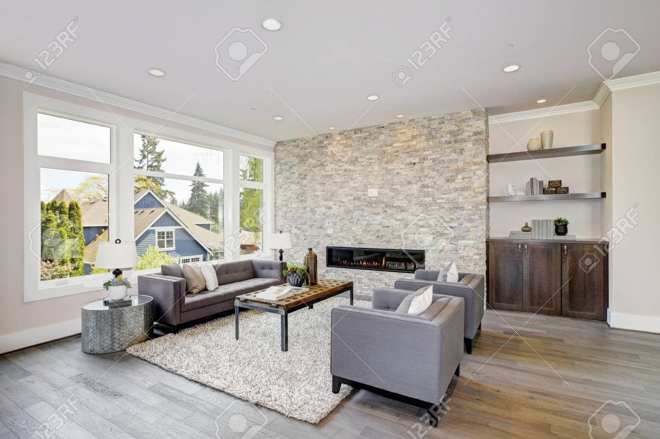 La Gran Sala Moderna Cuenta Con Una Chimenea De Piedra Del Piso Al Techo, Un Sofá Gris Empenizado Con Dos Sillones Grises Sobre Una Alfombra Mullida. Noroeste De Estados Unidos Fotos, retratos,